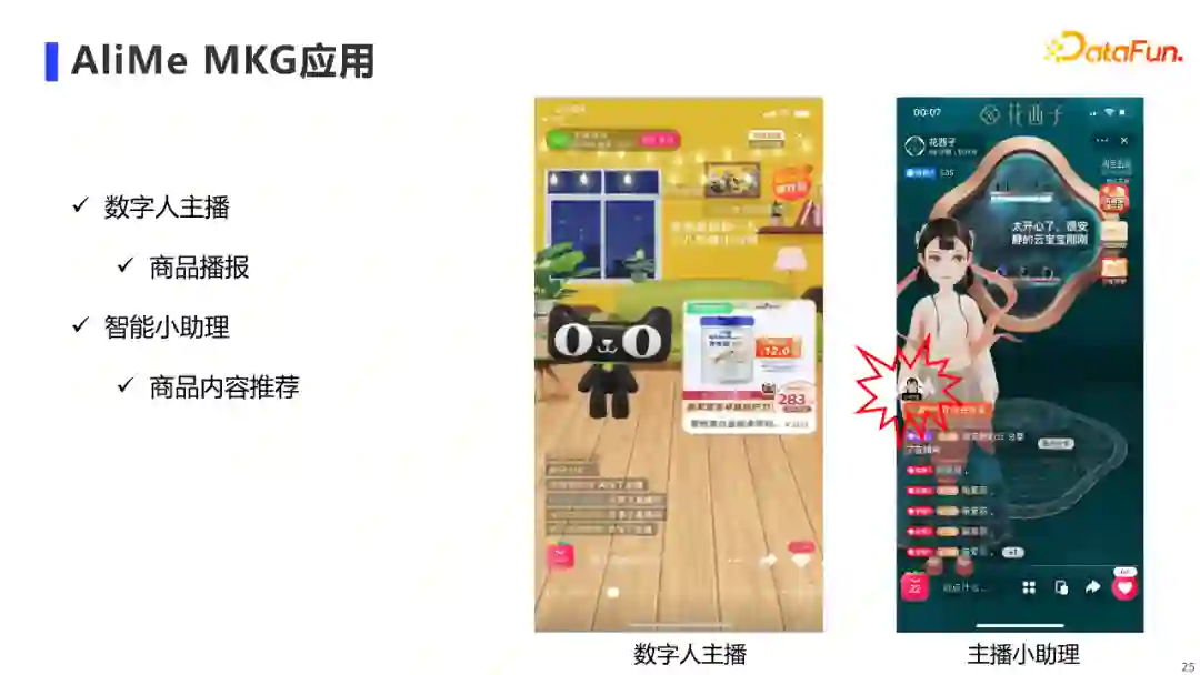 AliMe MKG在直播场景下主要有两类落地场景: * 数字人主播:即业务背景部分提到的「商品剧本播报」场景。 * 直播间智能小助理:我们在直播间也开发了一个智能小助理产品,AliMe MKG会在其中的「商品内容推荐」场景进行应用。