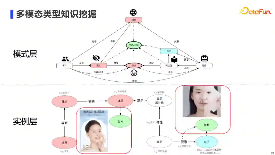 多模态知识挖掘,主要指实例层中红框标注的图片知识和视频知识挖掘。其中图片挖掘的数据源主要来自商品详情图,视频挖掘的数据源主要来自淘宝真人直播的视频片段。核心算法主要包括图文匹配技术及Video Grounding技术。