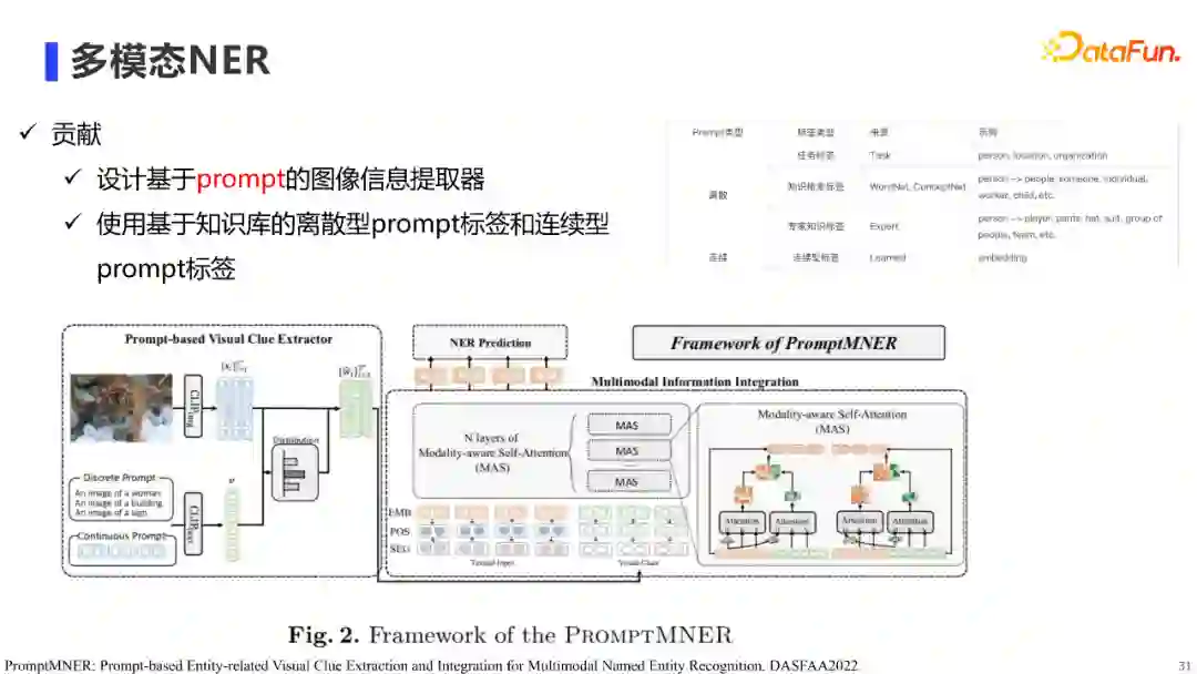 目前我们的多模知识图谱,主要从微淘文章、商品详情页、商品评论中进行知识挖掘,真人直播视频也只挖掘了比较粗粒度的视频片段。但其实真人直播的ASR文本中,也包含了很多有用的商品知识,可供我们进行知识挖掘,以扩充图谱的规模。例如,下面这段ASR文本,可以挖掘出商品的适用年龄和商品类别,一般这类知识,我们需要先进行NER,但是我们发现仅依靠文本的上下文,有时候会把红腰子的实体类型误分为食物而不是护肤品,而如果我们结合当前文本的直播画面,还是比较容易知道他指的是护肤品的,这里我们可以将其形式化成多模态NER任务。 同样,如果将红腰子这个实体链接到某个商品时,有时候也会有链指错误的问题,但是如果借助图片的话,我们也能很好地链接到左边这个商品,这里我们可以将其形式化为多模态Entity Linking的任务。针对这两类任务,我们目前也先行一步,在公开数据集上进行了相应的技术探索,下面我会分别针对这两个任务,介绍我们近期的工作。 1. 多模态NER