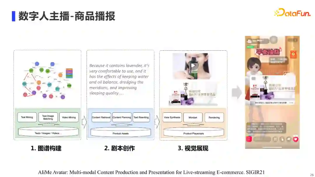 这里展示了AliMe MKG在数字人主播「商品播报」场景下应用的流程,本文主要focus在第一点图谱构建的工作上,第二点「剧本创作」和第三点「视觉展示」就不过多介绍了,感兴趣的朋友可以查阅我们团队在SIGIR和CIKM上发表的相关论文。