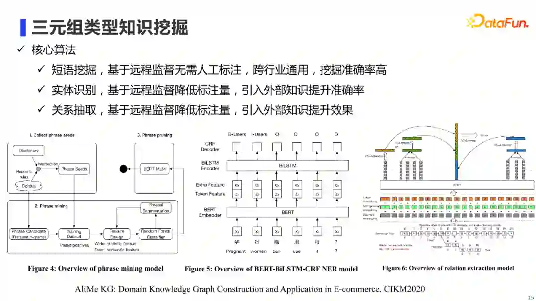 三元组类型知识的挖掘,概况起来主要是节点挖掘和关系构建技术。其中,节点挖掘主要通过短语挖掘和实体识别算法来实现,关系构建主要通过关系抽取算法来实现。