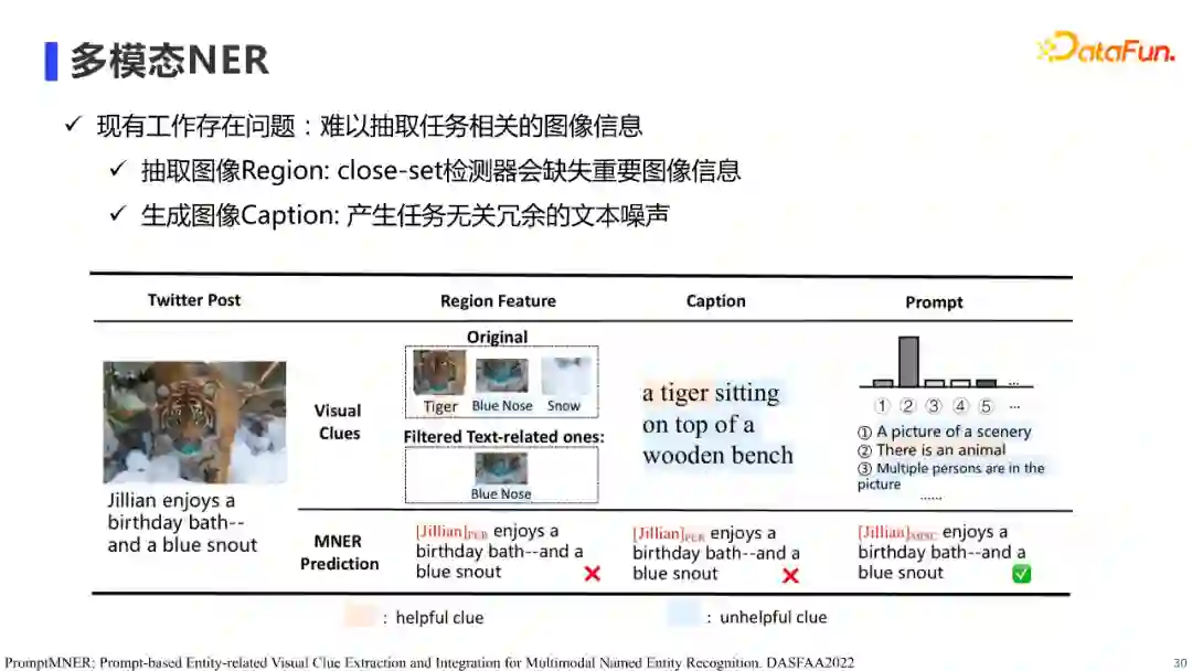 首先是多模态NER的工作,多模态NER主要指利用图片信息,增强文本NER的效果。这个任务的重点在于如何抽取有效的图片信息,以及如何将图片信息有效的融合到NER模型中。 现有工作主要使用两类方法进行图像信息抽取,第一类是使用目标检测器提取图片的Region特征并将其融入到文本中进行实体识别,这类方法的局限性在于受目标检测器标签有限性的影响,提取过程中可能会丢失重要的图片信息;第二类是生成图片Caption并将其融入到文本中进行实体识别,这类方法的局限性在于生成图片Caption过程中,会较易产生与任务无关的冗余的文本噪声。概况来说,现有方法并不能有效的提取图片信息。