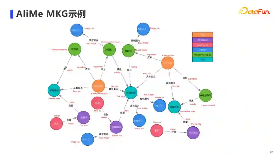 和其他知识图谱相比,AliMe MKG的特色主要可以归纳为三点: 第一是面向直播场景,其属于“种草”的场景,这要求我们能够对用户的需求进行主动引导;第二是需要构建有逻辑的知识链,来进行用户需求引导,例如阐明用户在什么生活场景下,会遇到什么痛点,进而产生什么诉求,而我们的商品正好可以满足这个诉求;最后一点是AliMe MKG不仅需要包含三元组,更需要包含内容,也就是说需要通过内容来连接用户和商品。 3. AliMe MKG的主要结构