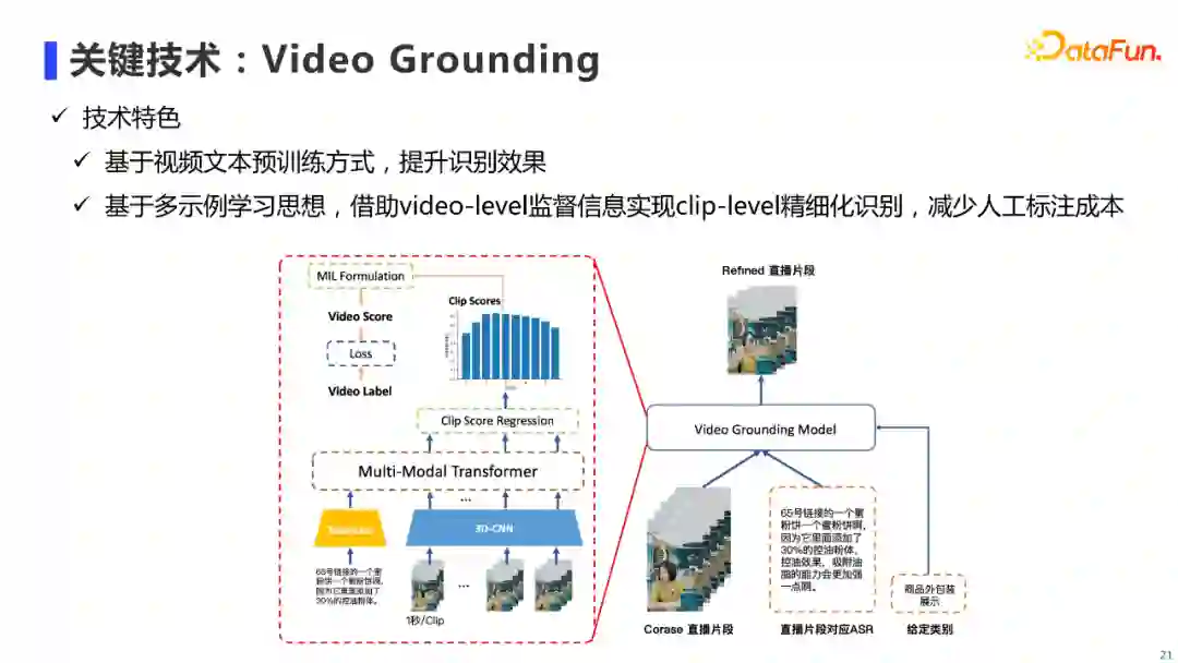 视频挖掘技术的核心算法是Video Grounding,指的是给定一个长视频片段及标签(e.g. 商品包装),从视频片段中提取出与标签有关的子片段,也就是需要进行clip级别的预测。我们使用真人直播片段及其对应的ASR文本,构成「视频-文本」对进行多模态预训练,来提升Video Grounding的效果。 具体来说,我们将直播片段分成以1秒为单位的若干个clip,并通过预训练过的3DCNN进行每个Clip的特征抽取,得到若干个视频clip的特征向量,然后和对应的ASR文本特征序列拼接起来,一同输入到单流Transformer中,进行多模态预训练。 在下游做Video Grounding任务时,我们会输入视频clip和ASR文本到经过预训练的Multi-Modal Transformer中进行多模态的特征交互,从而得到多模融合之后的视频clip序列特征,接着对这些特征回归出每个clip是否包含给定标签的概率。推理时,我们利用这些clip的概率进行视频片段的筛选。训练时,由于需要进行clip级别的预测,常规的做法需要对训练数据中视频的每一帧进行标注,人工标注成本是很大的。我们注意到对于视频片段中的每个clip,可以将其视为对应视频片段的一个Instance(示例),这样我们可以将Video Grounding任务转化为一个多示例学习(Multiple Instance Learning,MIL)问题。具体做法是对于每一个标签,我们可以将该标签所标记的全部视频作为正样本(Positive Bag),其他标签标记的视频作为负样本(Negative Bag)。然后将每个视频所有clip的概率,聚合成为该视频片段是否含有对应标签的概率,使用BCE损失函数指导模型学习。这样就通过视频级别的标签,学习到clip级别的信息,减少了人工标注成本。