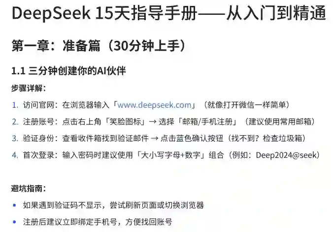本手册主要介绍了DeepSeek从入门到精通的全方位指导,包括准备篇、基础指令集、效率飞跃篇、自媒体运营、数据准备黄金法则、API开发者模式、日志分析图谱以及视频脚本等内容。