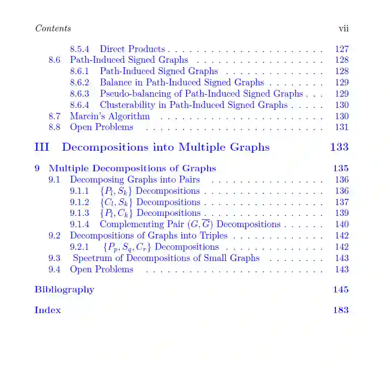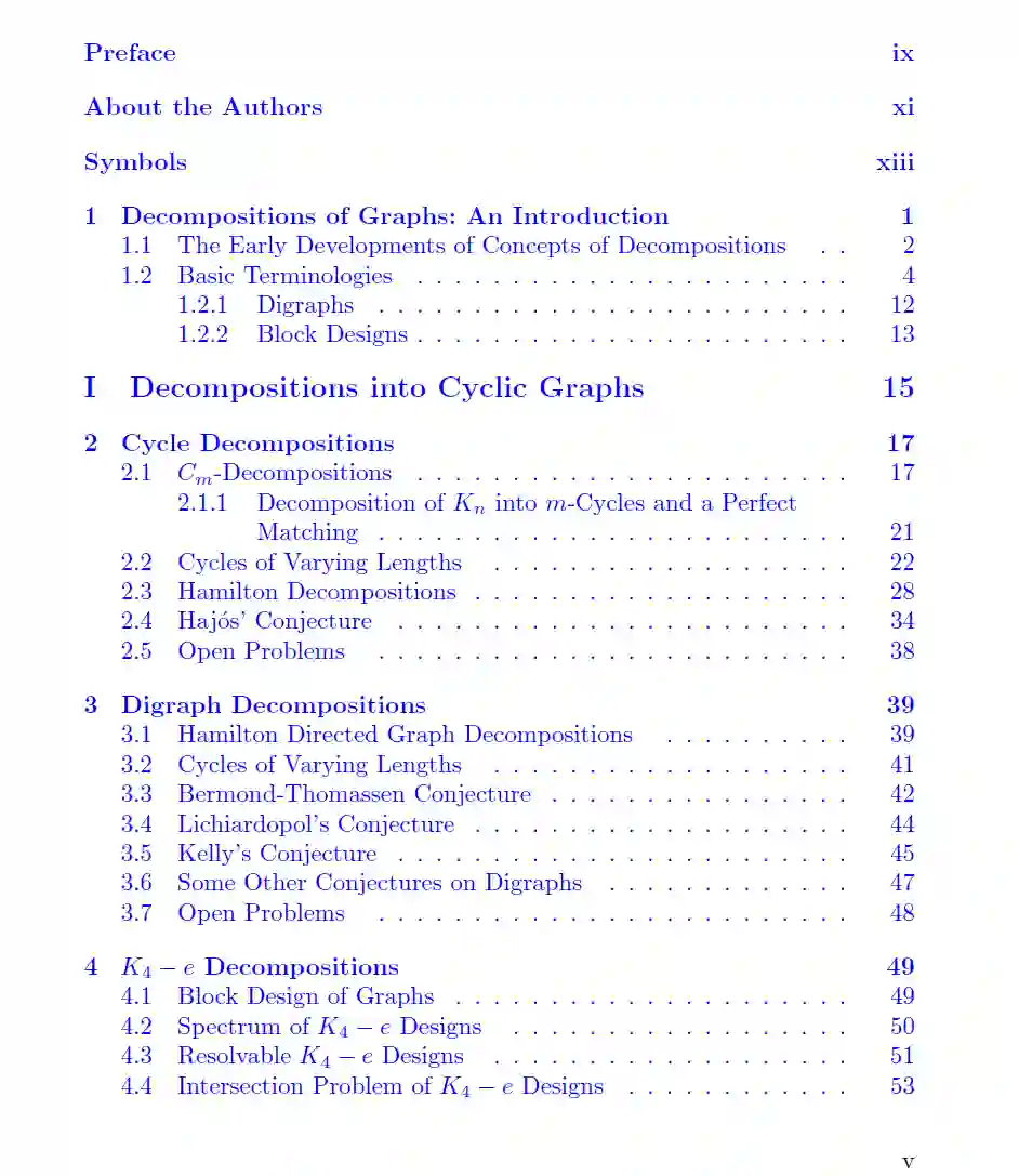 《图论与分解》一书涵盖了图的分解的主要领域。这是一本分为三部分、共九章的参考书,旨在面向爱好者以及研究学者。书中不仅回顾了历史演变和基本术语,还讨论了图的循环分解,如圈图、有向图和K4-e分解等。除了确定图的悬挂数之外,还讨论了将图分解为非循环图的方法,如一般树、路径和星形分解。书中总结了一种最近发展起来的分解技术,该技术将给定的图分解为多种类型的子图。关于图分解的主要猜想进行了详细的讨论。书中引用了一个包含500多篇专著和期刊文章的综合性参考文献列表。其中包含500多个定理、约100个定义、56个猜想、40个开放问题和一个算法。索引部分便于快速访问定义、主要猜想和命名定理。