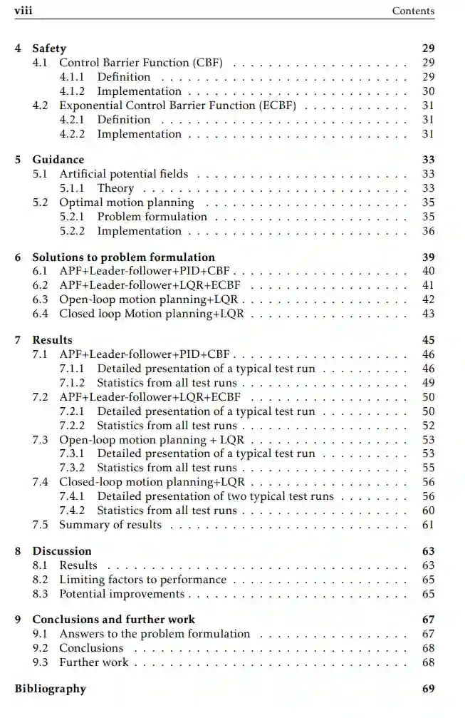 为了管理这些问题,我们提出了四个不同的解决方案算法。其中两个使用领导者-追随者控制来保持队形,使用人工势场(APF)进行路径规划,使用控制障碍函数(CBF)/指数控制障碍函数(ECBF)来保证控制信号的安全性,即无人机保持理想的安全距离。另外两个解决方案使用运动规划问题的优化控制问题表述,以产生开环或闭环轨迹,并使用线性二次调节器(LQR)控制器进行轨迹跟踪。轨迹在时间和队形保持方面进行了优化。解决方案中使用了两种不同的控制器。其中一个使用级联PID控制,另一个使用级联PID控制和LQR控制的组合。