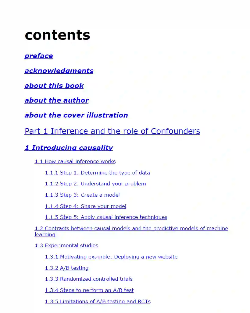 确定分析中是否拥有足够的变量 通过了解因果关系,你不仅可以做出基于数据的预测,还可以进行干预以影响结果。《数据科学中的因果推断》将展示如何构建数据科学工具,识别趋势和事件的根本原因。你将学习如何解读历史数据,理解客户行为,并为管理层提供决策支持,帮助其做出最优决策。购买本书的纸质版将免费附赠 PDF 和 ePub 格式的电子书(来自 Manning Publications)。关于技术为什么你会得到某个特定的结果?是什么因素导致了不同的结果?这些是因果推断中的核心问题。这一强大的方法论能够在无法进行实验、A/B 测试或昂贵的对照试验时,依然帮助你做出更好的决策,通过连接因果关系来改进决策。关于本书《数据科学中的因果推断》介绍了将因果推理应用于日常商业场景的技术。通过这本清晰易懂的实用指南,你无需掌握高级统计学或高等数学就能实践因果推断!通过应用基于有向无环图(DAG)的简单方法,你将学会如何评估广告效果、选择有效的健康治疗方案、制定合理的产品定价等。本书内容