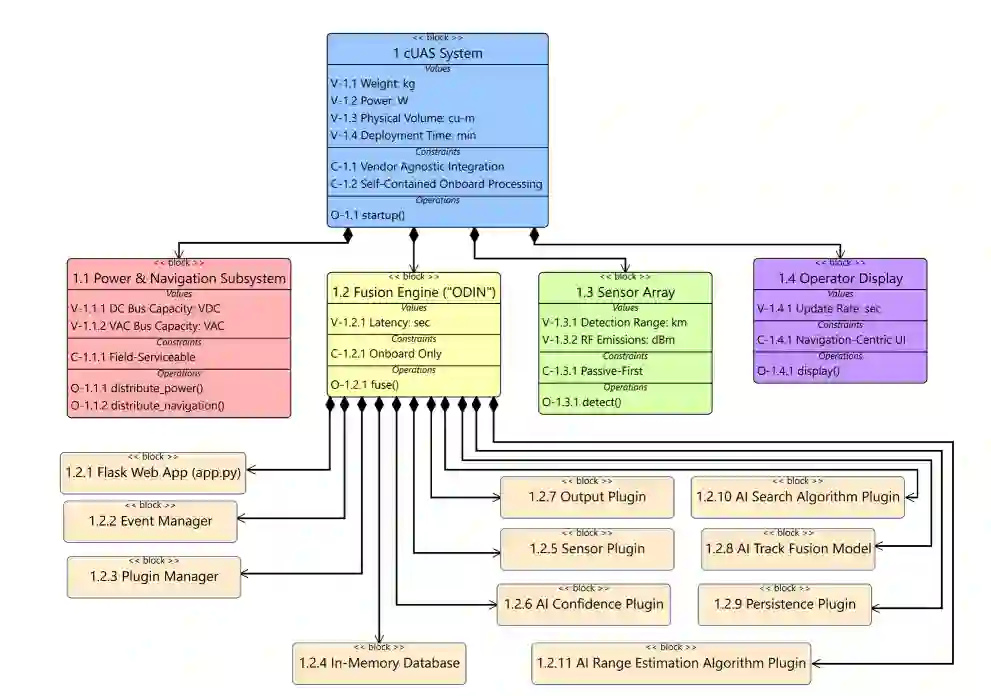 海上特种作战部队在电磁辐射管制条件下执行小型船只作业时,需要具备无源反无人机系统能力。本研究旨在应对将异构商用传感器集成到统一的、与供应商无关的探测架构中的系统工程挑战。开发了一个名为“作战数据集成节点”的模块化融合框架,其采用基于插件的软件架构,能够快速集成来自多个制造商的射频、光电/红外、雷达和声学传感器。该系统在“第25-4次联合机构野外实验”和“2025勇敢机器”演习中进行了广泛测试;演示了在72小时内使用不同数据协议成功集成五种传感器类型的能力。野外测试实现了操作员显示界面干扰减少90%以上、两秒内完成从无源到有源传感器的提示,并能在4级海况条件下持续运行。该研究通过对组件故障的成功现场修复证明了其远征可维护性,并验证了与供应商无关的架构对于联盟互操作性的可行性。