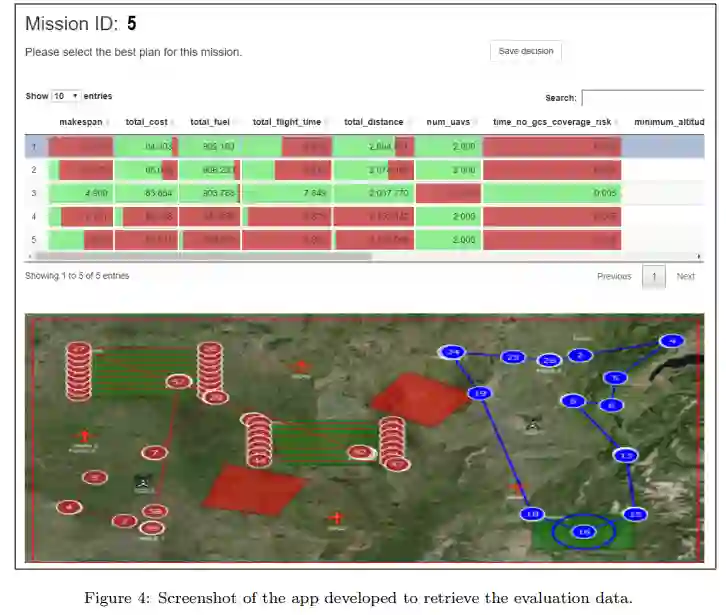如今,在大多数全球监控系统中,由于任务的高度复杂性,通常有多个操作员只负责一架无人机。该领域的主要目标之一就是降低这种复杂性,因此这种关系可以互换,在不久的将来,一名操作员就能控制多架飞行器。为此,主要要求之一是实现 MCMPP 的自动化并降低其复杂性。在以前的工作中,MCMPP 被表述为一个约束满足问题(CSP)(Ramirez-Atencia & Camacho,2018a)。在这项工作中,问题的变量是无人机对任务、GCS、传感器和其他变量的分配,并定义了若干空间和时间约束,以确保解决方案的一致性。然后,考虑到七个相互冲突的目标,使用多目标进化算法(MOEA)(Ramirez-Atencia et al. 在该算法中,推断出了帕累托最优前沿(POF)的估计值,从而得到了一个解决方案(任务计划)组合,尽管该组合在所考虑的冲突目标之间达到了最佳平衡。