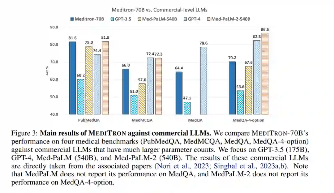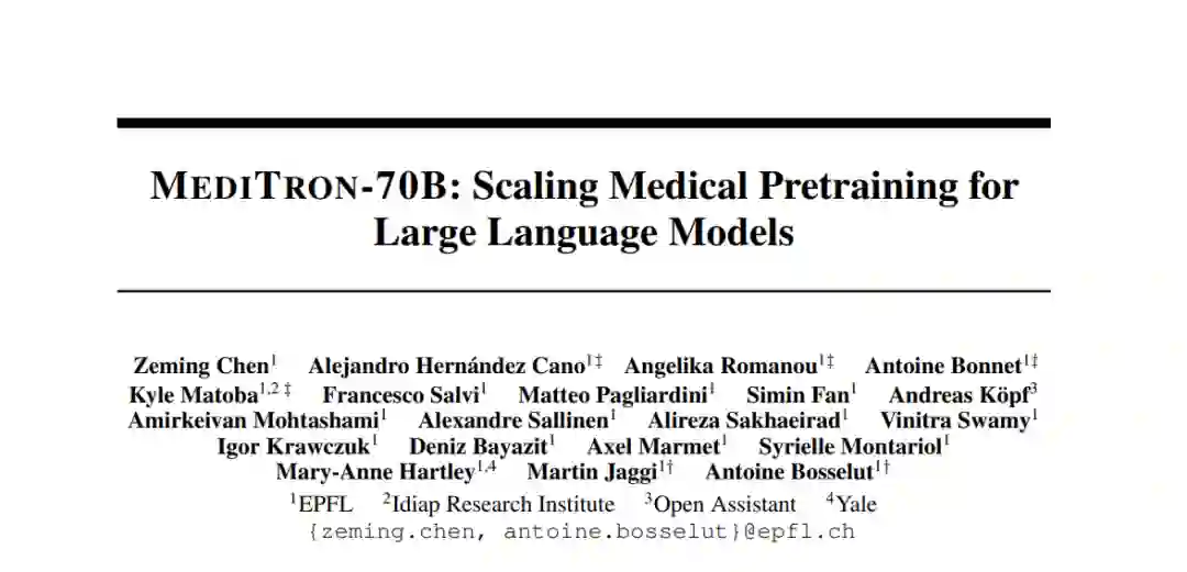 已经有许多努力试图利用和改进LLMs在医学知识和推理能力方面,但迄今为止,产生的AI要么是闭源的(例如MedPaLM和GPT-4),要么在规模上受限,约为130亿参数,这限制了它们的访问或能力。 为了改善访问和表现,洛桑联邦理工学院计算机与通信科学学院的研究人员开发了MEDITRON 7B和70B,一对分别具有7亿和70亿参数的开源LLM,适应于医学领域,并在他们的预印本MEDITRON-70B: Scaling Medical Pretraining for Large Language Models中进行了描述。