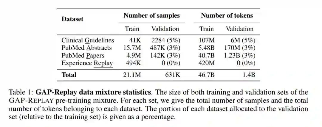 MEDITRON的领域适应性预训练语料库GAP-REPLAY结合了来自四个数据集的48.1B个词符;临床指南:来自各种医疗相关来源的46K份临床实践指南的新数据集,论文摘要:来自16.1M闭源PubMed和PubMed Central论文的公开可用摘要,医学论文:从500万份公开可用的PubMed和PubMed Central论文中提取的全文文章,以及回放数据集:一般领域数据提炼而成,占整个语料库的1%。