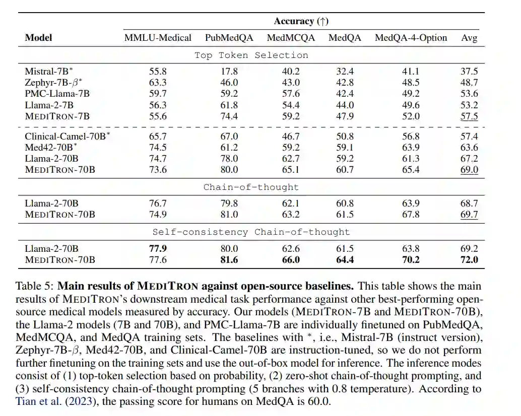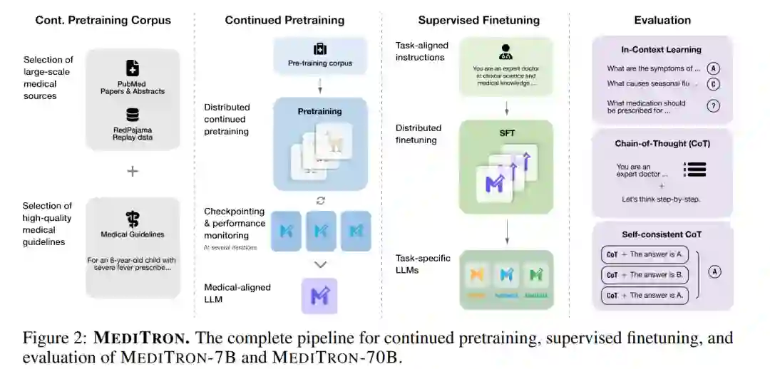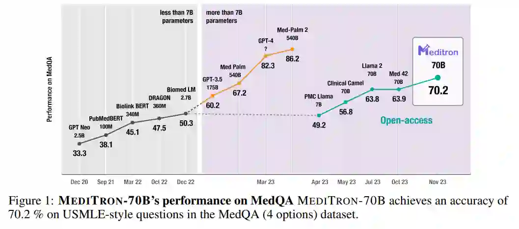 直到最近,LLMs主要针对通用任务进行开发和评估,主要使用从不同互联网来源收集的数据,这些数据在领域特定证据方面的质量各不相同(Rozière et al., 2023)。这种方法虽然通常非常强大,但会阻碍特定任务的性能,包括医学领域。一些新的特定任务模型,经过更精心策划的数据集训练,已经多次超越了通用模型(Wu et al., 2023b; Yue et al., 2023; Rozière et al., 2023; Azerbayev et al., 2023),揭示了在预训练数据方面平衡质量和数量的潜力。实现这种平衡的一个有希望的方法是使用通用LLMs,然后继续在更精选的领域特定数据上训练。这些系统获得了自然语言和领域特定语言理解及生成技能的结合(Gururangan et al., 2020)。在医学领域,这种方法仅在13B参数以下的模型中有报告(Lee et al., 2020; Gu et al., 2021; Peng et al., 2023; Wu et al., 2023a)。在更大规模(即≥70B参数)上,之前的研究仅探讨了指令调整(M42-Health)或参数高效微调(Toma et al., 2023)的范围。 在这项工作中,我们介绍了MEDITRON-7B和70B,这是一对用于医学推理的生成LLMs,由Llama-2(Touvron et al., 2023b)改编,通过在精心策划的高质量医学数据源上继续预训练:PubMed Central(PMC)和PubMed开放获取研究论文(通过S2ORC语料库收集,Lo et al., 2020),S2ORC中的PubMed摘要(来自非开放获取论文),以及从互联网收集的多种医学指南,涵盖多个国家、地区、医院和国际组织。为了支持训练,我们扩展了Nvidia的Megatron-LM分布式训练库,以支持Llama-2架构。 我们使用四个医学推理基准对MEDITRON进行评估,包括在上下文学习中(在提示期间提供示例,即在上下文窗口内)和特定任务的微调。基准包括两个医学考试题库,MedQA(来自美国医学执照考试,Jin et al., 2020)和MedMCQA(医学领域的多主题多选题数据集,Pal et al., 2022),PubMedQA(基于PubMed摘要的生物医学问答,Jin et al., 2019)和MMLU-Medical(来自大规模多任务语言理解的医学主题评估集,Hendrycks et al., 2021a)。在没有微调的情况下使用上下文学习,MEDITRON-7B超过了几个最先进的基线,显示出比PMC-Llama-7B(一种类似的LLM,由Llama改编,通过在PubMed Central论文上继续预训练,Touvron et al., 2023a)平均10%的性能提升,以及比Llama-2-7B模型平均5%的性能提升。在特定任务训练数据上微调后,MEDITRON的性能也在同等规模的其他微调基线上有所提升,达到了5%(7B)和2%(70B)的平均性能提升。最后,将MEDITRON-70B微调以支持高级提示策略,如思维链和自我一致性,进一步提高了最佳基线3%和最佳公开基线12%的性能。总的来说,MEDITRON在医学推理基准上表现强劲,在同等规模的最先进基线上匹敌或超越。