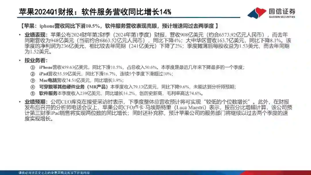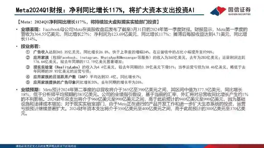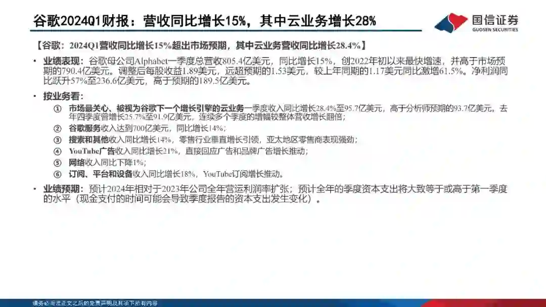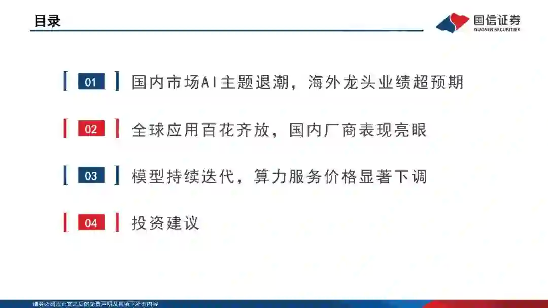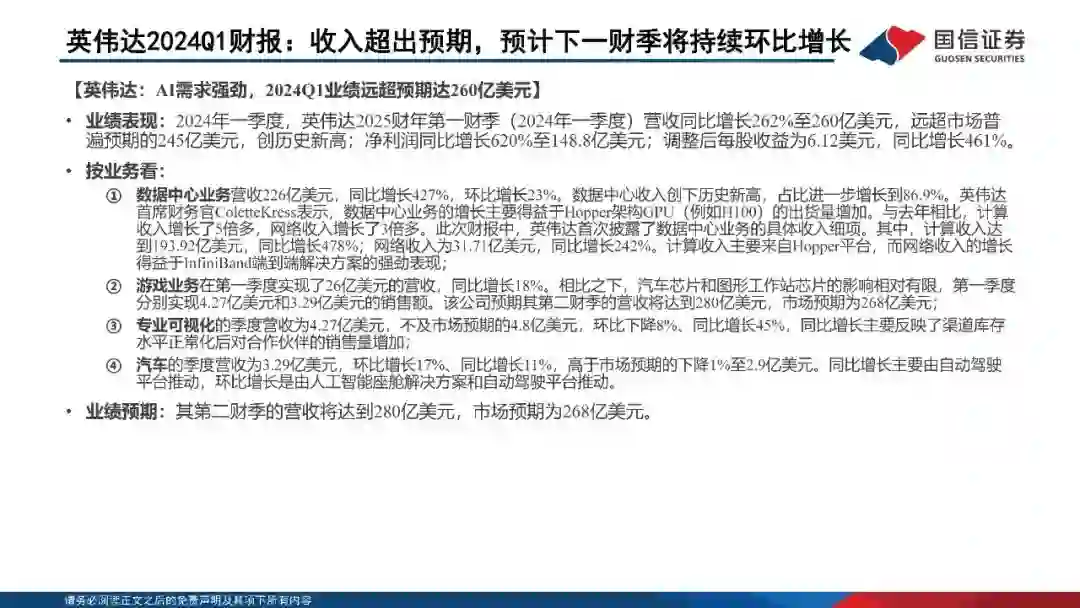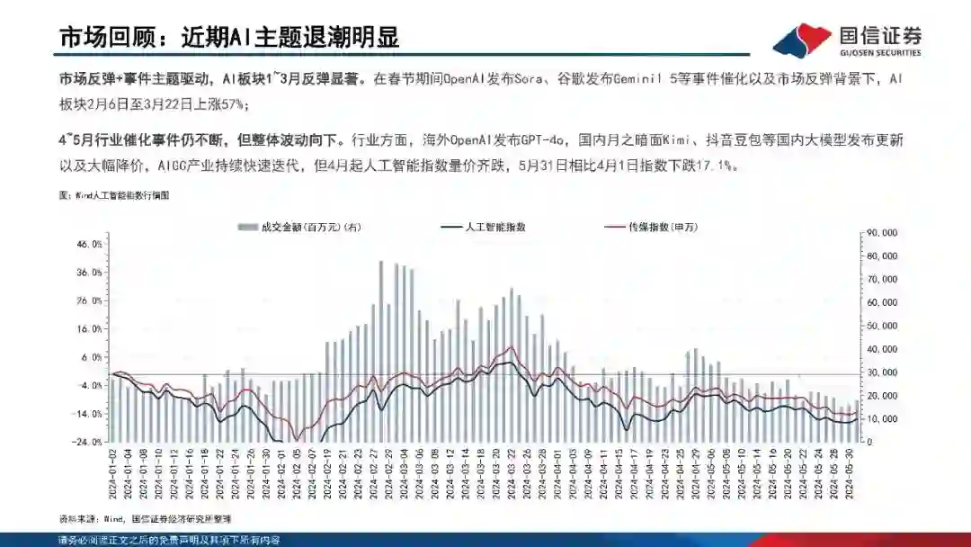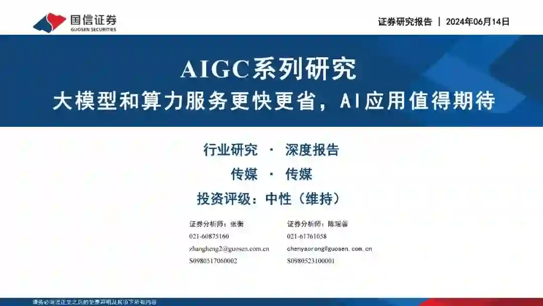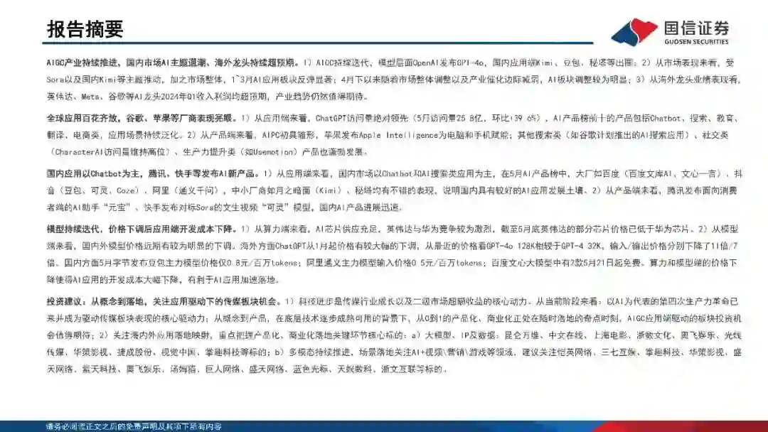 AIGC产业持续推进,国内市场AI主题退潮、海外龙头持续超预期。1)AIGC持续迭代,模型层面OpenAI发布GPT-4o,国内应用端Kimi、豆包、秘塔等出圈;2)从市场表现来看,受Sora以及国内Kimi等主题推动,加之市场整体,1~3月AI应用板块反弹显著;4月下以来随着市场整体调整以及产业催化边际减弱,AI板块调整较为明显;3)从海外龙头业绩表现看,英伟达、Meta、谷歌等AI龙头2024年Q1收入利润均超预期,产业趋势仍然值得期待。 全球应用百花齐放,谷歌、苹果等厂商表现亮眼。1)从应用端来看,ChatGPT访问量绝对领先(5月访问量25.8亿,环比+39.6%),AI产品榜前十的产品包括Chatbot、搜索、教育、翻译、电商类,应用场景持续泛化。2)从产品端来看,AIPC初具雏形,苹果发布Apple Intelligence为电脑和手机赋能;其他搜索类(如谷歌计划推出的AI搜索应用)、社交类(CharacterAI访问量维持高位)、生产力提升类(如Usemotion)产品也蓬勃发展。 国内应用以Chatbot为主,腾讯、快手等发布AI新产品。1)从应用端来看,国内市场以Chatbot和AI搜索类应用为主,在5月AI产品榜中,大厂如百度(百度文库AI、文心一言)、抖音(豆包、可灵、Coze)、阿里(通义千问),中小厂商如月之暗面(Kimi)、秘塔均有不错的表现,说明国内具有较好的AI应用发展土壤。2)从产品端来看,腾讯发布面向消费者端的AI助手“元宝”、快手发布对标Sora的文生视频“可灵”模型,国内AI产品进展迅速。 模型持续迭代,价格下调后应用端开发成本下降。1)从算力端来看,AI芯片供应充足,英伟达与华为竞争较为激烈,截至5月底英伟达的部分芯片价格已低于华为芯片。2)从模型端来看,国内外模型价格近期有较为明显的下调。海外方面ChatGPT从1月起价格有较大幅的下调,从最近的价格看GPT-4o128K相较于GPT-432K,输入/输出价格分别下降了11倍/7倍。国内方面5月字节发布豆包主力模型价格仅0.8元/百万tokens;阿里通义主力模型输入价格0.5元/百万tokens;百度文心大模型中有2款5月21日起免费。算力和模型端的价格下降使得AI应用的开发成本大幅下降,有利于AI应用加速落地。