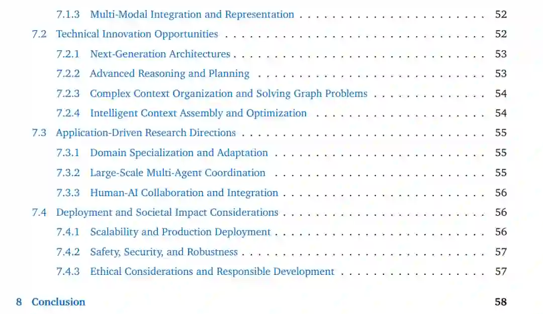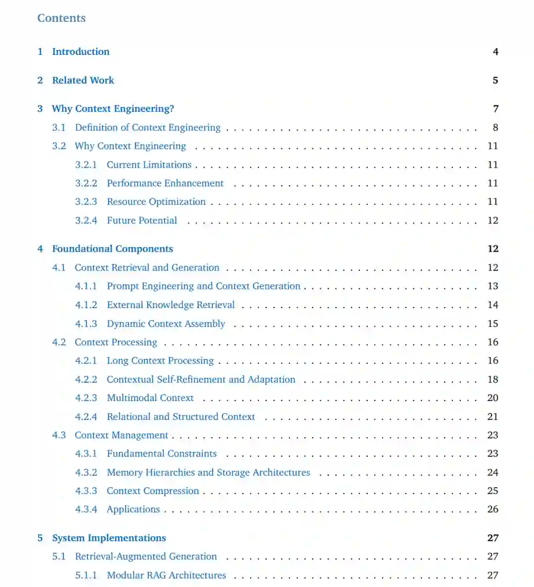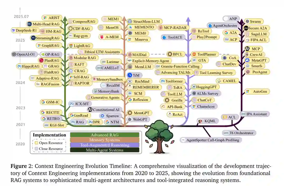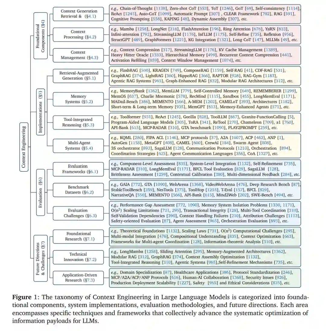 摘要: 大型语言模型(LLMs)的性能从根本上取决于推理过程中提供的上下文信息。本综述介绍了“上下文工程”这一正式学科,它超越了简单的提示设计,涵盖了对LLMs信息负载的系统化优化。我们提出了一个全面的分类法,将上下文工程分解为其基础组件和将这些组件整合进智能系统的复杂实现。首先,我们审视了基础组件:(1)上下文检索与生成,包括基于提示的生成和外部知识获取;(2)上下文处理,解决长序列处理、自我优化以及结构化信息整合;(3)上下文管理,涵盖了记忆层次、压缩与优化。接着,我们探讨了这些组件如何架构化整合,形成复杂的系统实现:(1)检索增强生成(RAG),包括模块化、智能体化和图增强架构;(2)记忆系统,实现持久交互;(3)工具集成推理,用于函数调用与环境交互;(4)多智能体系统,协调通信与编排。通过对超过1400篇研究论文的系统分析,本综述不仅为该领域建立了技术路线图,还揭示了一个关键的研究空白:当前模型与上下文工程的增强使其在理解复杂上下文方面表现出色,但在生成同样复杂的长篇输出方面仍存在明显限制。解决这一空白是未来研究的核心任务。最终,本综述为研究人员和工程师提供了一个统一的框架,推动上下文感知AI的发展。