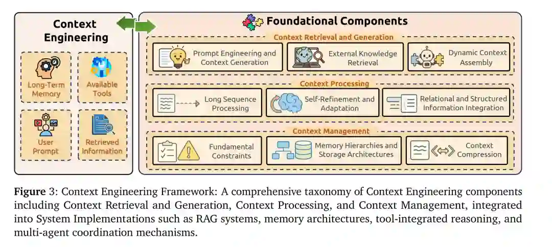 上下文工程建立在三个基础组件之上,这些组件共同应对大型语言模型中信息管理的核心挑战:上下文检索与生成通过提示工程、外部知识检索和动态上下文组装来获取适当的上下文信息;上下文处理通过长序列处理、自我优化机制和结构化数据整合来转化和优化获取的信息;上下文管理通过解决基本约束、实施复杂的记忆层次结构和开发压缩技术,处理上下文信息的高效组织和利用。这些基础组件为所有上下文工程实现奠定了理论和实践基础,形成了一个全面的框架,在这个框架中,每个组件都解决了上下文工程流程中的不同方面,同时保持协同关系,从而实现全面的上下文优化和有效的上下文工程策略。