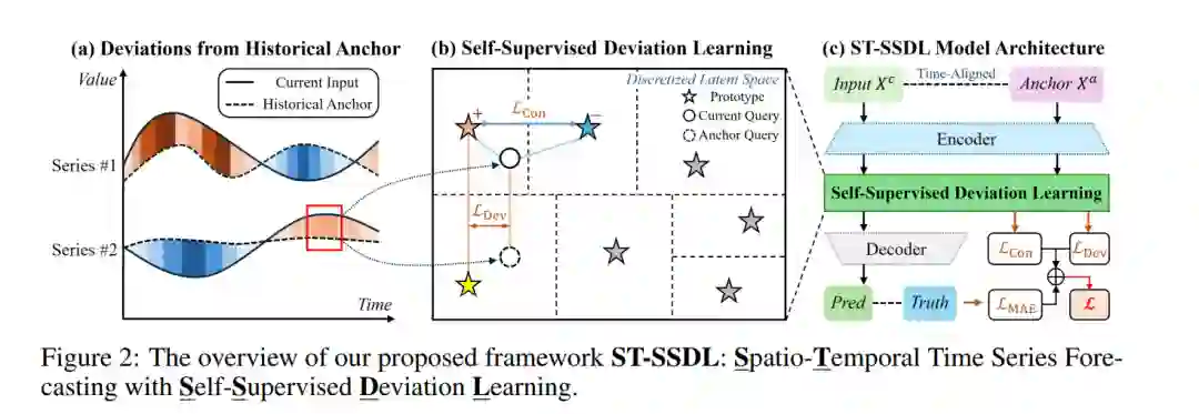 摘要| 时空预测(Spatio-temporal forecasting)在交通管理、城市计算等现实应用中具有关键作用。尽管近年来的方法在预测精度上取得了显著提升,但它们往往未能充分考虑当前输入与历史模式之间的动态偏差(dynamic deviations)。这些偏差蕴含着重要信号,对模型性能有着显著影响。为此,我们提出了一种新的时空时间序列预测框架 ST-SSDL(Spatio-Temporal Self-Supervised Deviation Learning),通过引入自监督偏差学习机制(Self-Supervised Deviation Learning),用于捕获并利用这种动态偏差信息。 ST-SSDL将每个输入锚定到其历史平均状态,并通过可学习原型(learnable prototypes)对潜在空间进行离散化,这些原型表示典型的时空模式。为进一步优化该结构,我们设计了两个辅助目标: (1)对比损失(contrastive loss),用于增强不同原型间的判别性; (2)偏差损失(deviation loss),用于正则化输入表示与对应原型间的距离一致性,从而量化偏差程度。 这些组件与主预测目标联合优化,共同引导模型在隐藏空间中形成结构化的模式组织,并提升其在多样输入条件下的泛化能力。在六个基准数据集上的实验结果表明,ST-SSDL在多项指标上均显著优于当前最先进的基线方法。可视化分析进一步验证了该方法在复杂时空场景中对不同偏差程度的自适应响应能力。 项目代码与数据集可在以下链接获取: 🔗 https://github.com/Jimmy-7664/ST-SSDL