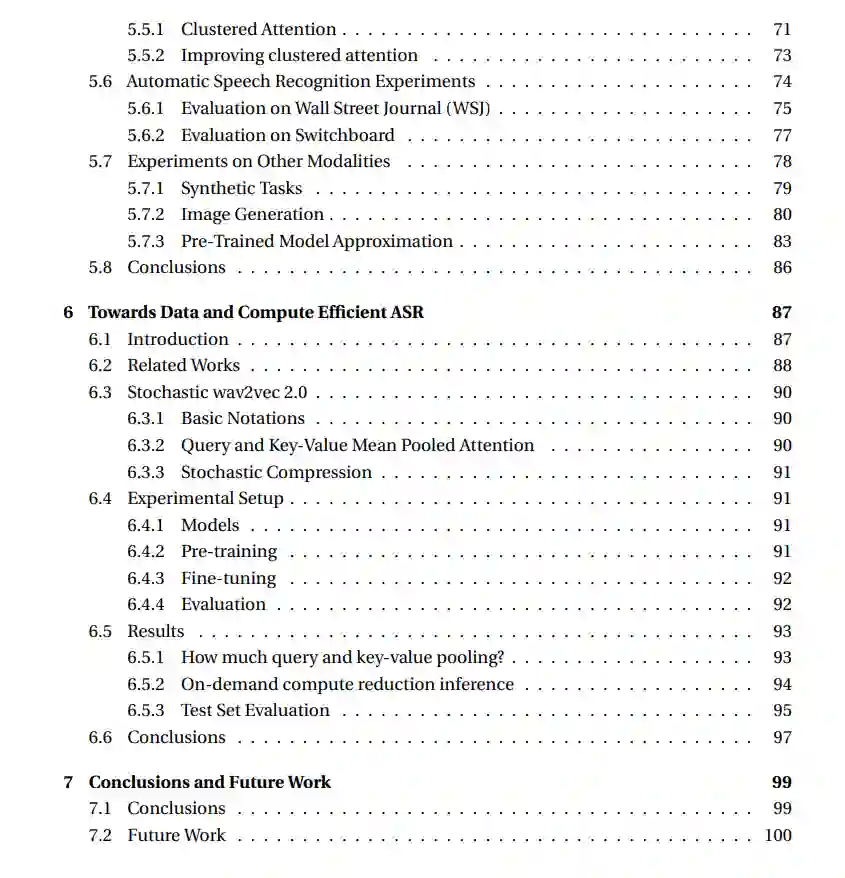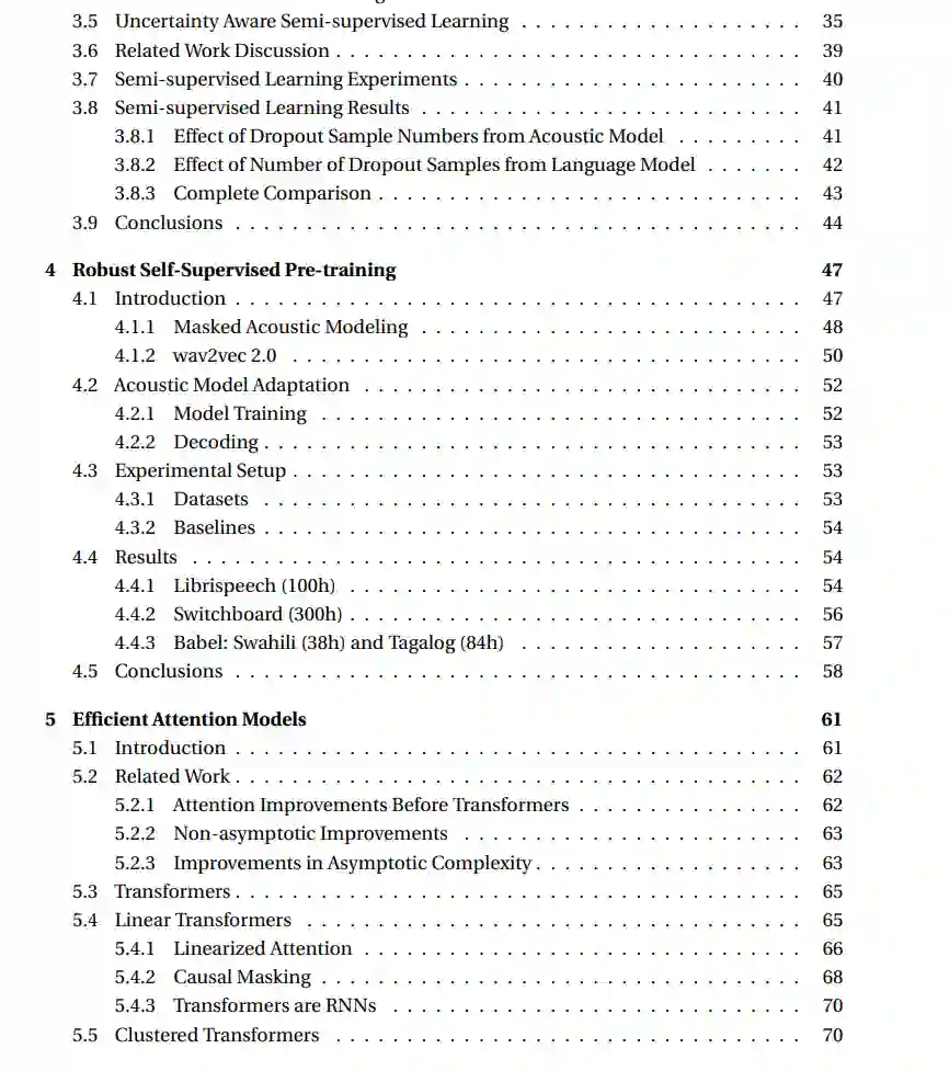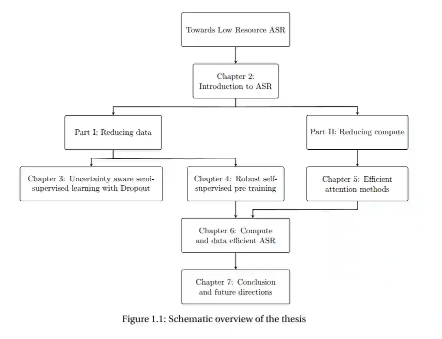 **训练基于深度神经网络的自动语音识别(ASR)模型通常需要数千小时的转录数据,将其限制在少数语言中。此外,目前最先进的声学模型基于Transformer架构,该架构随着序列长度的二次增长,阻碍了其对长序列的使用。本文旨在减少(a)数据和(b)开发最先进的ASR系统的计算需求,只有几百小时或更少的转录数据。本文的第一部分着重于减少训练这些模型所需的转录数据量。本文提出一种使用dropout进行不确定性感知半监督学习的方法。该方法为未标记数据的训练产生了更好的假设。研究了两种流行的自监督预训练方法的域外和跨语言泛化:掩码声学建模和wav2vec 2.0。两种预训练方法都可以泛化到未见过的域,并明显优于仅用监督数据训练的模型。https://infoscience.epfl.ch/record/297304?ln=en在第二部分中,专注于减少Transformer模型的计算需求,(a)通过设计高效的注意力计算形式,(b)通过减少注意力计算的输入上下文长度。**本文首次提出"线性"注意力,使用注意力的核公式将自回归transformer表示为递归神经网络,并将序列长度的计算复杂度从二次降低到线性。提出"聚类"注意力,通过对输入序列进行聚类并使用质心进行计算来近似自注意力。在给定的计算预算下,聚类注意力优于普通注意力。对于ASR,我们发现线性注意力导致词错误率下降,而聚类在处理较短序列时引入了开销。为解决这一限制,本文开发了一种方法,用均值池化对输入进行随机下采样,以实现高效的wav2vec 2.0训练。这使得在推理过程中可以在不同的压缩因子下使用相同的模型。对wav2vec 2.0预训练的随机压缩,能够为转录数据有限的语言建立计算高效的ASR模型。