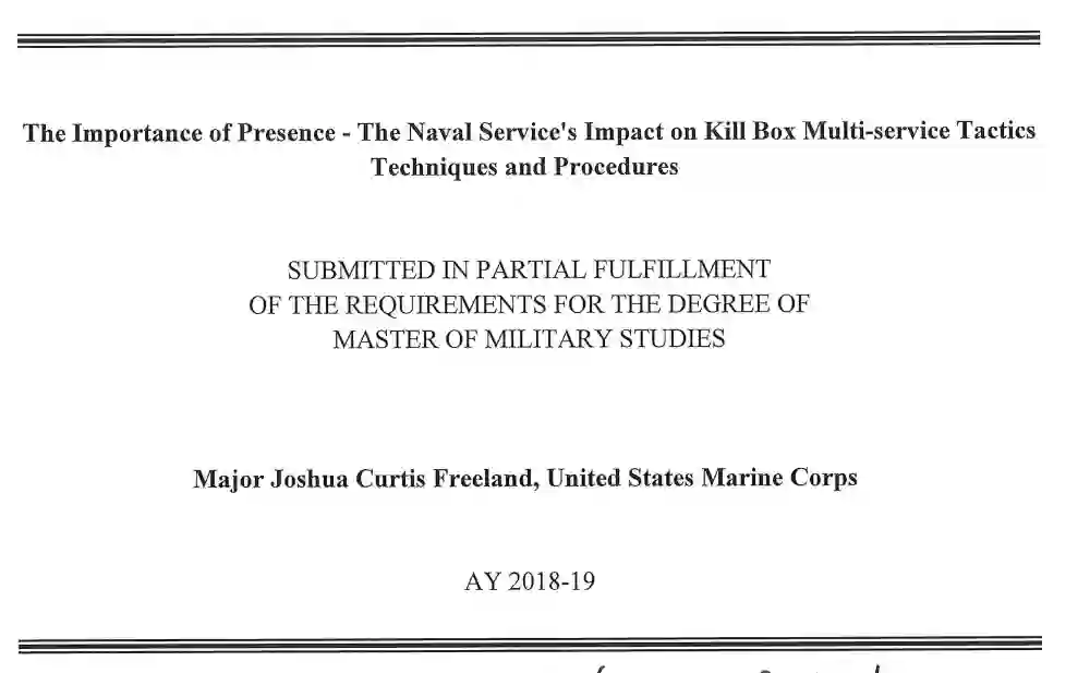 1973年,美国陆军训练与条令司令部和空军战术航空司令部开始对话,为1975年空地部队机构(ALFA)的建立奠定了基础。在整个80年代,ALFA制定了 "用今天的军队对付今天的威胁 "的程序。海军和海军陆战队的兴趣始于1980年代中期,当时ALFA的程序开始跨入海军感兴趣的领域,并在1992年达到高潮,海军派出代表加入ALFA。该机构将其名称改为空陆海应用(ALSA)中心,但为今天的战士开发程序的章程仍然是一样的。杀伤盒是一本现代多兵种战术技术和程序(MTTP)手册,是一种固有的联合火力支援协调措施,但海军在整合联合火力方面的历史知识未能达到完全纳入杀伤盒MTTP中。本研究试图找出在伊拉克自由行动中对海军行动取得固有成功的杀伤盒的指挥和控制延迟了不到十年的根本原因。该研究的结论来自于ALSA提供的原始数据、与ALSA工作组参与者的口述历史以及对杀伤盒发展的个别服务文化的历史分析。