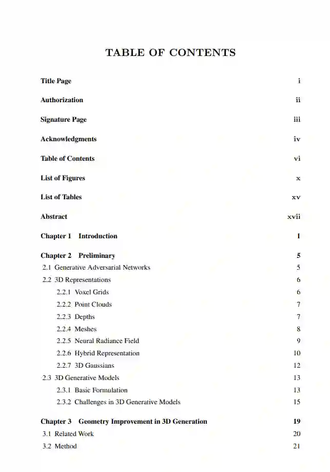 生成模型近年来在二维和视频合成领域取得了显著进展。然而,二维和视频生成中仍然存在明显的不一致性,例如光照和几何相关的问题。引入三维建模有望增强二维和视频生成的连贯性与真实感,从而推动三维生成技术的进一步发展。鉴于直接用于生成建模的大量三维数据收集存在挑战,从单视图图像学习三维分布成为一种可行的三维生成方法。这种方法得益于大量可用的非结构化、高质量且多样化的单视图图像数据。一种常见的从单视图图像生成三维内容的策略是采用生成对抗网络(GAN),并用三维渲染器替代生成器。本论文从四个角度探讨了三维生成领域。首先,我们研究生成的几何形状,并提出通过将三维感知注入到生成器和判别器中来增强学习到的几何结构。其次,我们分析了三维生成模型训练中对姿态的要求,并解除生成器对姿态先验的限制,从而实现更灵活的三维生成模型。第三,在复杂场景合成的背景下,我们分析了现有方法的不足,并提出利用三维先验来促进从单视图场景图像进行三维建模。第四,我们还将讨论高效三维生成表示的引入,特别是高斯散点表示(Gaussian Splatting)。最后,我们展望了三维生成领域的未来发展方向。深度学习的快速发展[21]显著推动了计算机视觉领域中的许多任务,例如视觉对象识别[22, 23]、目标检测[24, 25, 26]、图像渲染[27, 28, 1]等,并在诸多方面便利了我们的日常生活,如自动驾驶[29, 30]、生物研究[31]和智能创作[32, 33]。在所有技术类型中,生成建模[34, 35, 36]在数据分析和机器学习中发挥了重要作用。与直接对输入进行预测的判别模型不同,生成模型旨在再现数据分布,以便能够从中采样新的实例。为此目的,它们需要全面地表征数据。例如,检测模型可以忽略与任务无关的信息(如颜色)而不影响性能,但生成模型需要管理图像的每个细节(如物体排列以及每个物体的纹理)以实现令人满意的生成。从这一角度来看,学习生成模型通常更具挑战性,但同时也促进了一系列应用[37, 38, 39, 33]。近年来,深度生成模型[35, 34, 36]在二维图像合成[33, 40, 41]方面取得了令人难以置信的成功。然而,在二维空间中学习生成模型已逐渐难以满足某些现实世界应用的需求,因为我们的物理世界实际上是三维的。以电影行业为例,我们期望设计三维数字资产,而不仅仅是生成二维图像,以带来身临其境的体验。现有的内容创作流程通常需要大量专业知识和人力投入,这既耗时又昂贵。许多开创性的尝试[42, 43, 44, 45, 2, 46]旨在研究如何自动生成三维数据,但这类研究仍处于早期阶段。二维生成和三维生成之间的关键区别之一在于数据格式。具体而言,二维图像可以自然地表示为像素值的数组,便于神经网络[22, 23]处理。而常见的三维表示形式(如点云[47, 48]、网格[49, 50]和体素网格[51, 52])则难以直接被卷积神经网络处理。最近,隐式表示形式Neural Radiance Field(NeRF)[1]被提出用于通过学习从坐标到三维属性的映射来建模三维对象,成为与神经网络兼容的良好表示形式。最新研究[2, 6, 53, 3, 46, 54, 55, 45, 56, 4, 57]通过将NeRF与生成对抗网络(GAN)[34]结合,使三维生成成为可能,从而发展出一种三维感知的GAN。具体而言,它们用三维渲染器替代GAN中的生成器。这种替换使得在生成图像时可以显式地控制视点,从而得益于生成器的三维感知能力。三维生成的难点还来源于训练数据的获取。在理想情况下,高质量三维资产的全面集合对于准确的生成建模至关重要。然而,使用设备大规模获取此类数据极其困难。一种引人注目的方法是探索从二维生成数据集中转移知识的潜力。一种可行的方法是利用二维单视图图像数据集学习三维表示。每个三维对象通常对应多个从不同视点拍摄的相似图像,具有类似的结构。例如,在数据集中可能仅有不超过两张同一人脸的图像。鉴于人脸的共同结构特性,从不同角度拍摄的多样化图像中提取通用人脸特征是可行的。这使得模型能够想象每个人脸的未见视图。通过这种方式,可以探索如何从二维单视图图像集合中学习三维生成。构建高效三维生成器需考虑以下几个关键因素: