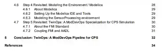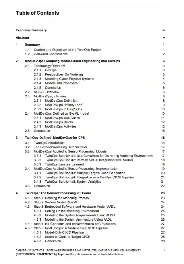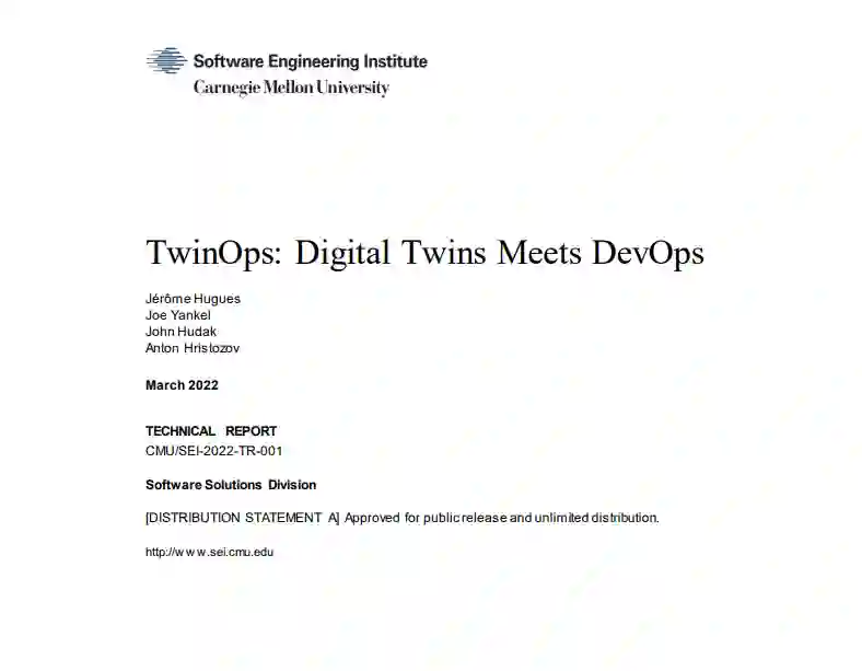 本报告总结了 TwinOps 项目的贡献,这是一个由软件工程学院资助并在 2020 财年执行的为期一年的项目。这项研究的贡献有两方面。首先,它介绍了 ModDevOps 作为一种创新方法,使用 DevOps 概念和模型代码生成来桥接基于模型的工程和软件工程。 ModDevOps 平滑地从模型级验证和验证 (V&V) 过渡到软件生产。其次,该研究开发了 TwinOps,这是一种特定的 ModDevOps 管道,通过在构建模型工件时对其进行仔细组合,使系统工程师具备新的分析能力。