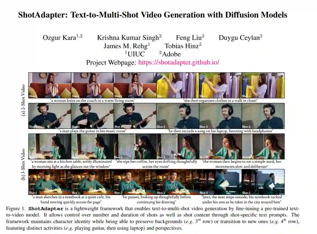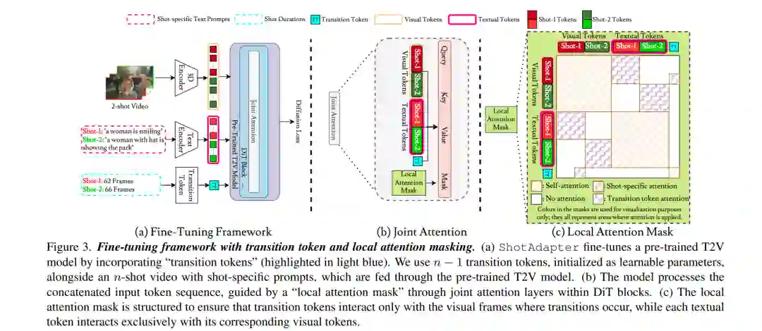 当前基于扩散模型的文本生成视频方法仅限于生成单一镜头的短视频片段,尚不具备生成包含多个镜头转换的视频能力,尤其是在保持同一角色在相同或不同背景下执行不同动作的一致性方面存在显著限制。为了解决这一问题,我们提出了一个新的框架,该框架包括一个数据集构建流程和对现有视频扩散模型的结构扩展,从而实现文本生成多镜头视频(text-to-multi-shot video generation)。 我们的方法能够将多镜头视频作为一个整体进行生成,并在所有镜头的所有帧之间实现全局注意力机制(full attention),从而确保角色和背景的一致性。此外,用户可以通过**镜头级条件控制(shot-specific conditioning)**自由设定视频中镜头的数量、时长和内容。 该能力的实现依赖于两个关键技术创新: 1. **过渡标记(transition token)**的引入,用于控制新镜头在视频中何时开始; 1. 局部注意力遮蔽策略(local attention masking strategy),用于控制过渡标记的作用范围,并支持镜头级文本提示。