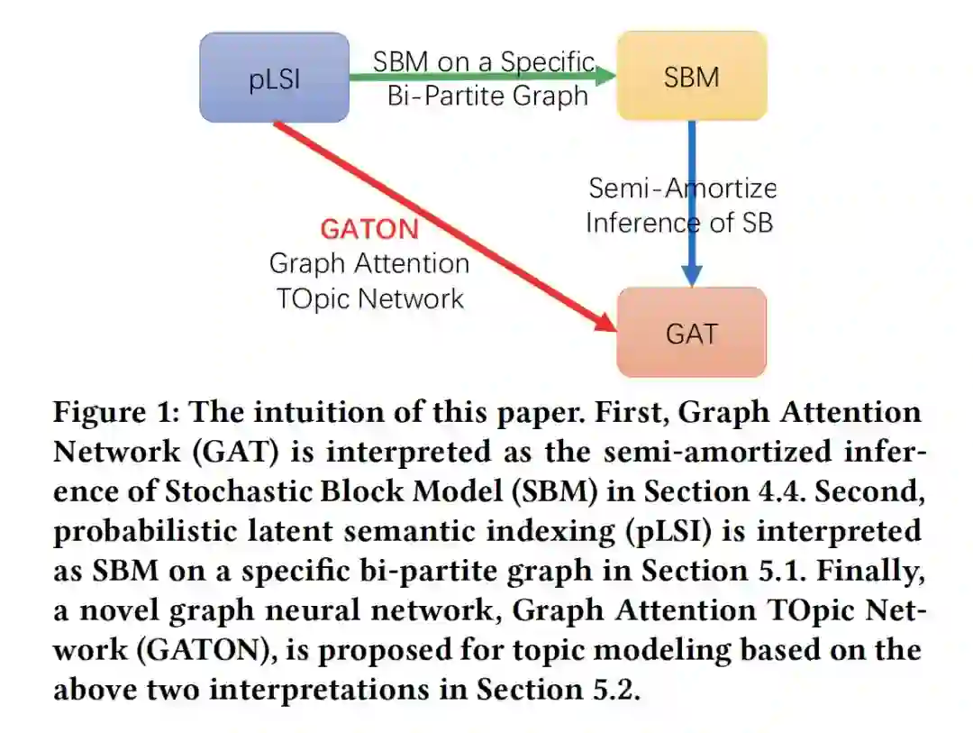 摘要:现有的主题模型(topic modeling)方法存在一些问题,包括概率潜在语义索引模型(Probablistic Latent Semantic Indexing,PLSI)过拟合问题、隐狄利克雷分配(Latent Dirichlet Allocation,LDA)模型不能能捕捉主题间丰富的主题相关性与推理复杂度高等问题。本文提出了一种新的方法来克服pLSI的过拟合问题,用嵌入单词的平摊推理(amortized inference)作为输入,代替LDA中的狄利克雷先验。对于生成性主题模型,大量的自由隐变量是过拟合的根源。为了减少参数个数,平摊推理用一个具有共享(平摊)可学习参数的函数代替了对隐变量的推理。共享参数的数量是固定的,并且与语料库的规模无关。为了克服平摊推理在独立同分布(I.I.D)数据中应用的局限性,根据以下两个观察结果,我们提出了一种新的图神经网络--图注意力主题网络(GATON),用于对非I.I.D文档的主题结构进行建模。首先,pLSI可以解释为特定二分图上的随机块模型(SBM)。其次,图注意力网络(GAT)可以解释为SBM的半平摊推理(semi-amortized inference),它放宽了I.I.D数据的vanilla 平摊推理假设。GATON提供了一种新颖的基于图卷积运算的方案,去聚合单词相似度和单词共现结构。具体地说,词袋文档表示被建模为二分图拓扑。同时,将捕获词相似性的词嵌入建模为词节点的属性,并采用词频向量作为文档节点的属性。基于加权(注意力)图卷积操作,词共现结构和词相似度模式被无缝地集成在一起进行主题识别。大量实验表明,GATON在主题识别方面的有效性不仅有利于文档分类,而且能显著细化输入词的嵌入。