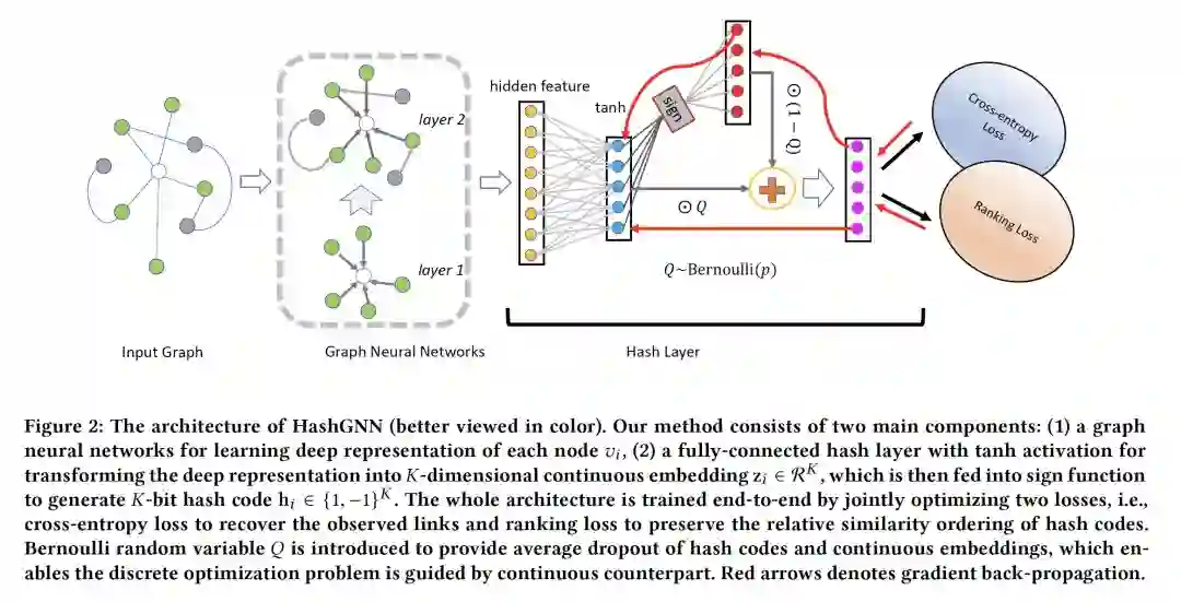 摘要:工业推荐系统一般包括两个阶段:召回和排名。召回是指从海量的项目语料库中高效地识别出数百个用户可能感兴趣的候选项目,而排名的目标是使用复杂的排名模型输出精确的排名列表。近年来,图表示学习在支持大规模高质量候选搜索方面受到了广泛关注。尽管它在用户-项目交互网络中学习对象的嵌入向量方面是有效的,但在连续嵌入空间中推断用户偏好的计算代价是巨大的。在这项工作中,我们研究了基于图神经网络(GNNs)的哈希高质量检索问题,并提出了一种简单而有效的离散表示学习框架来联合学习连续与离散编码。具体地说,提出了一种基于GNN的深度哈希算法(HashGNN),它由两部分组成,一个是用于学习节点表示的GNN编码器,另一个是用于将表示编码为哈希码的哈希层。整个框架通过联合优化以下两个损失进行端到端的训练,即通过重建观察到的连接而产生的重建损失,以及通过保留哈希码的相对顺序产生的排序损失。我们还提出了一种基于直通估计器(straight through estimator ,STE)指导的离散优化策略。其主要思想是在连续嵌入指导下避免STE的反向传播中的梯度放大,在这种情况下,我们从学习一个更容易模仿连续嵌入的更简单的网络开始,并使其在训练过程中发展直至最终返回STE。在三个公开可用数据集和一个真实的阿里巴巴公司数据集的综合实验表明,我们的模型不仅可以达到连续模型的性能,而且在推理过程中运行速度快了好几倍。