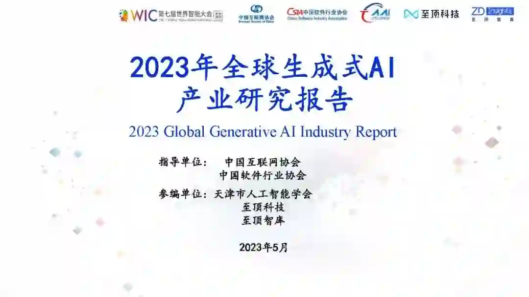 在此背景下,在中国互联网协会、中国软件行业协会指导下,天津市人工智能学会、至顶科技、至顶智库联合发布《2023年全球生成式AI产业研究报告》,该报告从全球视角出发,对生成式AI的产业概况、 基础设施、算法模型、场景应用、机遇挑战等方面进行梳理,全面展现生成式AI的产业发展情况,为政府部门、行业从业者、教育工作者以及社会公众更好了解生成式AI提供参考。
