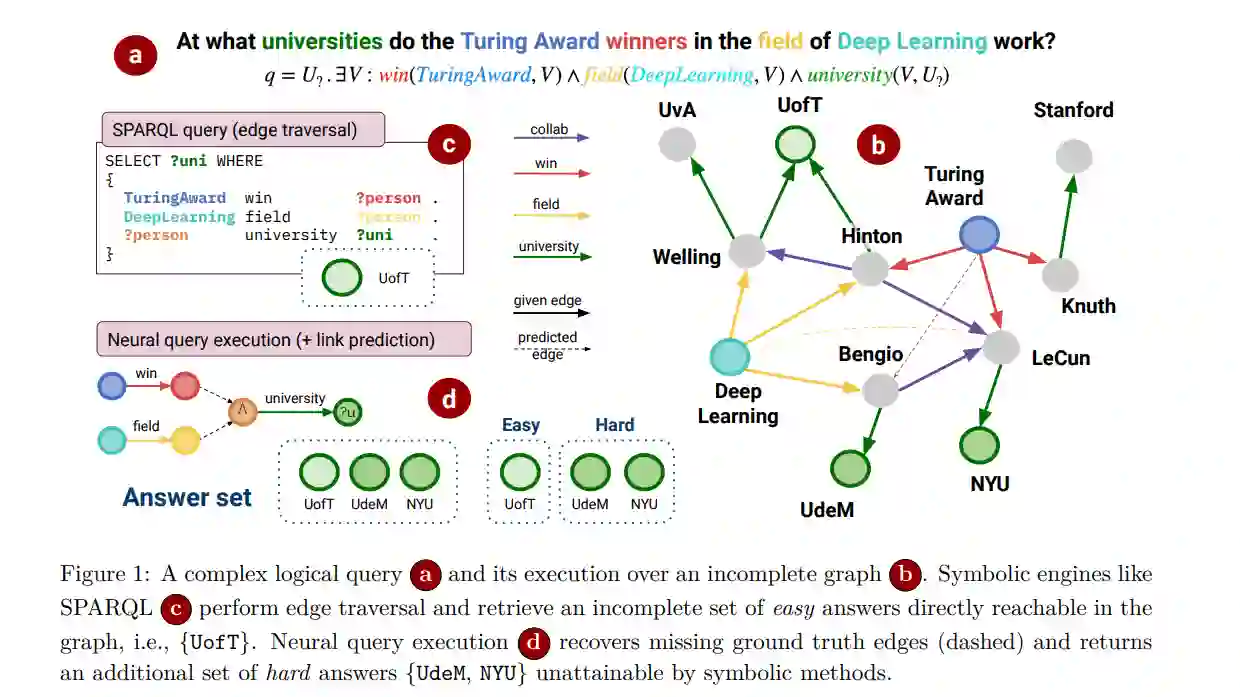 复杂逻辑查询回答(CLQA)是图机器学习中最近出现的一项任务,它超越了简单的单跳链路预测,解决了在潜在空间中大量可能不完整的图上进行多跳逻辑推理的更复杂任务。该任务在社区中获得了显著的关注;大量工作沿着理论和实践的坐标轴扩展了该领域,以高效的系统处理不同类型的复杂查询和图模态。文中从图类型(模态、推理领域、背景语义)、建模方面(编码器、处理器、解码器)、查询支持(操作符、模式、投影变量)、数据集、评估指标和应用等多个角度对CLQA进行了全面的综述和详细的分类。在改进CLQA任务的同时,引入了神经图数据库(NGDBs)的概念。NGDB扩展了图数据库(graph DBs)的思想,由神经图存储和神经图引擎组成。在神经图存储中,我们设计了一个图存储,一个特征存储,并使用编码器在潜在嵌入存储中进一步嵌入信息。给定一个查询,神经查询引擎学习如何执行查询规划和执行,以便通过与神经图存储交互有效地检索正确的结果。与传统的图数据库相比,NGDBs允许使用嵌入存储对不同模态的特征进行灵活和统一的建模。此外,当图是不完整的时,它们可以提供正常图数据库无法恢复的健壮的答案检索。最后,指出了NGDB未来的研究方向、存在的问题和应用前景。