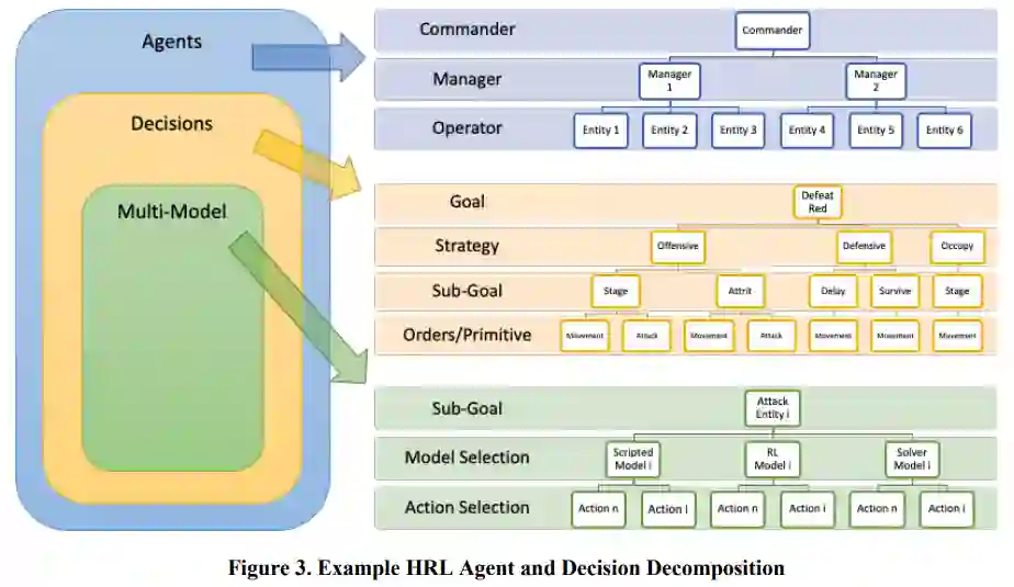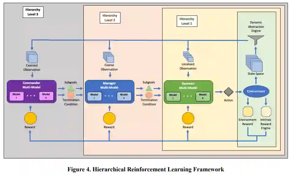 研究利用 RL 已证明的潜力和 HRL 最近取得的成功,打算进一步提高扩展机器学习的能力,以开发智能体行为,用于战斗建模和仿真中常见的大型复杂场景。为了实现这一目标,我们打算吸收文献中的许多见解,同时为这一领域做出我们自己的独特贡献。研究主要分为五个研究领域:(1) HRL 训练框架和作战单元的智能体架构;(2) 用于智能体决策的多模型框架;(3) 状态空间的维度不变观测抽象;(4) HRL 框架的内在奖励工程;(5) 将此框架实施到高保真作战模拟中。本文仅关注前三个研究领域。