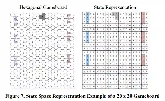 图 7 显示了一个 20 x 20 棋盘的状态空间表示示例,其中叠加了三个通道(蓝色部队、红色部队、城市六角形)。我们在下面所有图中叠加了三个通道,仅供参考;但在 Atlatl 中,这些通道将表示为 3 个独立通道(共 17 个通道),如图 6 所示。