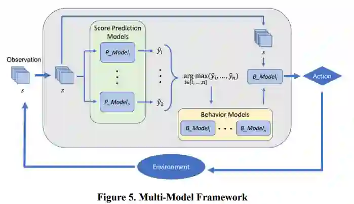 多模型框架如图 5 所示。在每个行动选择步骤中,多模型都会接收一个观察结果作为输入,并将其传递给每个得分预测模型。每个得分预测模型都会推导出一个预测的游戏得分,并将其输入评估函数。然后根据评估函数选择特定的行为模型。最后,原始观察结果被传递给选定的行为模型,由其产生一个动作。