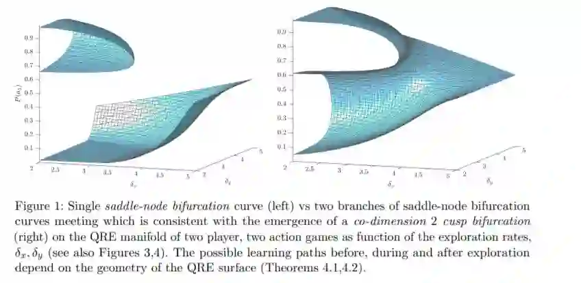 该研究的主要任务转向衡量「探索」对集体系统性能的影响。研究者在低维 MAL 系统中表征 QRE 表面的几何形状,并将该研究的发现与突变(分歧)理论联系起来。具体而言,随着探索超参数随着时间的演化,系统会经历相变。在此过程中,给定探索参数的无穷小变化,均衡的数量和稳定性可能会发生剧烈变化。在此基础上,该研究提供了一种形式理论处理方法,即如何调整探索参数能够可验证地产生均衡选择,同时对系统性能带来积极和消极(以及可能无限)的影响。