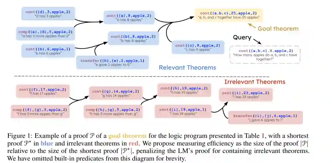 现代语言模型(LMs)展现出了强大的演绎推理(deductive reasoning)能力,然而标准化评估往往只关注推理结果的正确性,而忽视了类人推理中的一个关键方面——效率。 在真实世界的推理场景中,绝大部分可用信息都是无关的,而高效的演绎推理需要能够识别并忽略这些干扰信息。 我们提出了一个基于逻辑编程(logic programming)视角的框架,用于评估语言模型的推理效率。该框架引入了一种简洁的方法,用于将语言模型生成的自然语言证明(natural language proofs)与通过执行逻辑程序所得的最短证明(shortest proofs)进行对齐。模型的效率通过衡量其在推理过程中避免不必要推理步骤的能力来量化。 在实证研究中,我们构建了一个数学文字题(math word problems)数据集,并在其中注入不同数量、不同语义重叠程度的无关公理(irrelevant axioms)。结果表明,当前的语言模型在此类条件下的推理准确率显著下降——即使这些干扰最小且与领域语义一致——并且其生成的证明中经常出现绕行于无关推理的冗余步骤。
