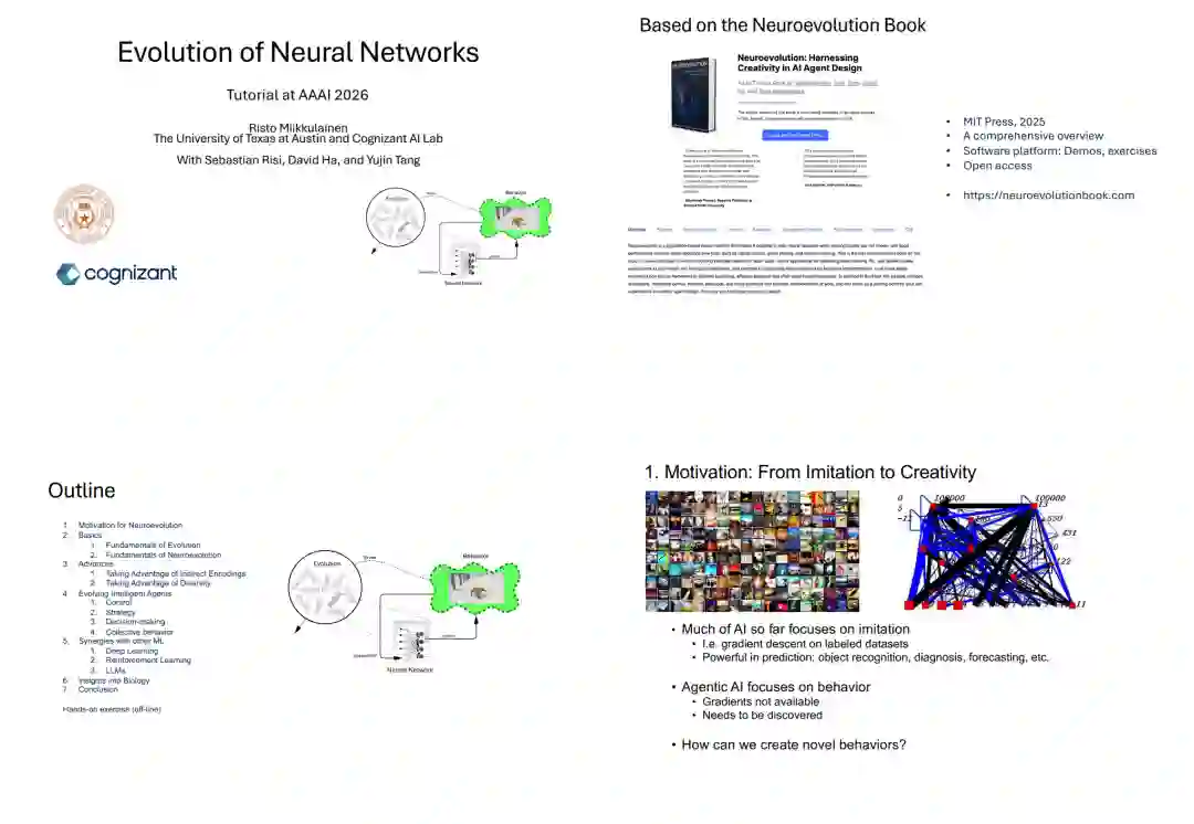 摘要:神经演化(Neuroevolution),即利用进化计算优化神经网络,是一种通过基于种群的搜索(Population-based search)构建智能体的方法。在具有稀疏及多目标强化信号(Sparse and multiobjective reinforcement)的部分可观测领域(Partially observable domains)中,该方法表现尤为卓越。相比于其他策略搜索技术,神经演化的核心优势在于其广泛的探索能力,这使其能够发掘出高效且往往出人意料的解决方案。 其主要应用领域涵盖机器人控制、游戏智能体及决策制定。近期,该领域已进一步扩展至深度学习架构搜索(NAS)、生物智能演化机理研究以及硬件导向的神经网络优化。此外,神经演化与强化学习(RL)及大语言模型(LLMs)之间也展现出了显著的协同潜力。本教程旨在引导参与者掌握神经演化的基础理论,进阶探讨提升其有效性与泛化性的前沿课题,回顾典型应用案例,并提出未来的研究方向。通过可选的动手实践环节,参与者将加深对核心概念的具象理解,并能迅速应用神经演化技术开展研究。 https://www.cs.utexas.edu/~risto/talks/aaai26-tutorial/
