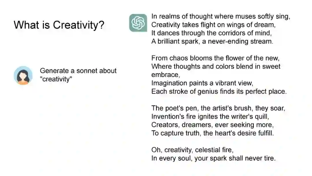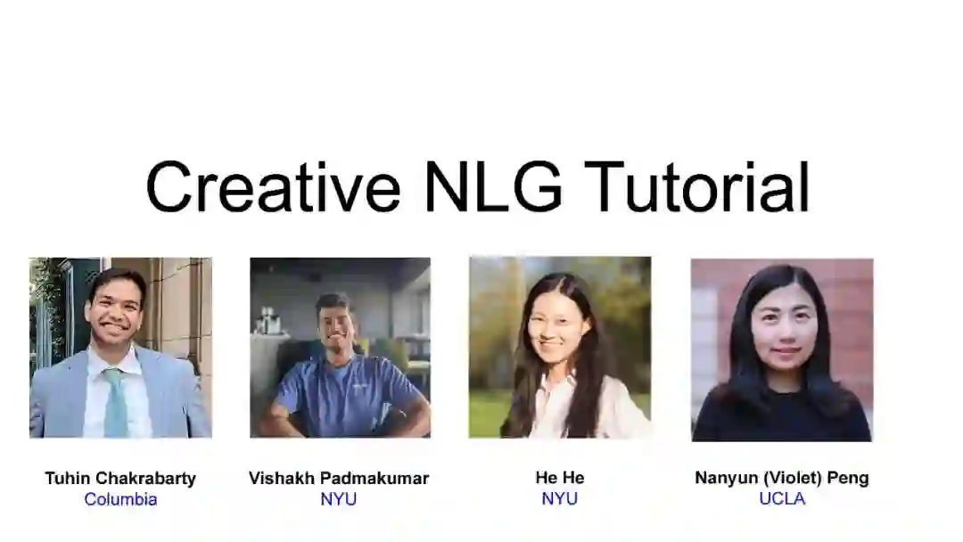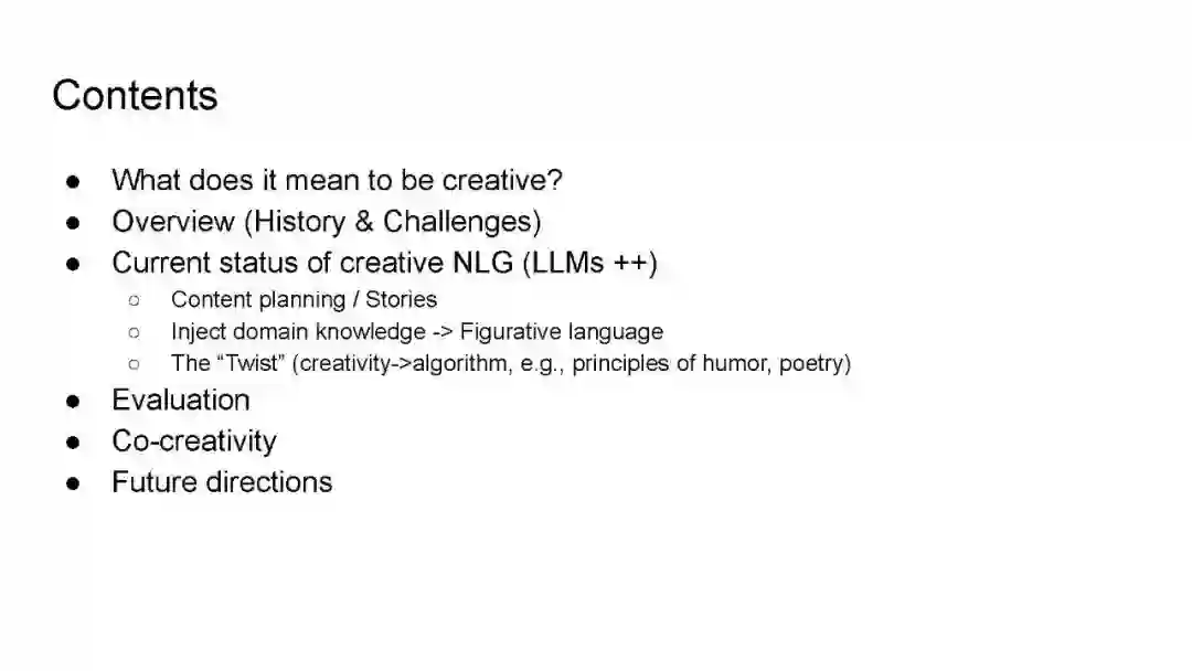 大型语言模型如GPT-3、GPT-4、Claude等,在文本摘要和机器翻译等多个自然语言生成任务中推进了最新技术水平。然而,当涉及到以创造力为重点的开放式任务,如生成故事、诗歌或各种形式的比喻性语言时,这些最先进的语言模型通常被发现是不足够的。本教程旨在提高对开放领域创意生成这一重要且新兴研究领域的认识,重点是语言生成,同时也涉及多模态生成(例如,图像字幕,视觉隐喻)。它针对的是自然语言处理(NLP)和人工智能(AI)研究人员以及对构建能够模仿和增强人类创造力的系统感兴趣的创意写作从业者。特别是,我们将回顾近期关于创意语言生成的研究,包括句子级别和更长形式的文本。我们将为观众提供一个整体视角,包括1)构建创意语言生成系统的重要性和挑战;2)我们如何结合内容规划、领域知识和特定于创意的启发式规则来生成不同形式的创意语言,如故事、诗歌、幽默、隐喻等;3)我们如何为创意文本生成构建更好的评估方法,在独立和互动环境中都如何?特别是,AI的最新进展如何塑造创意领域未来的劳动力?我们将通过概述该领域未来研究方向的方式来结束本教程。