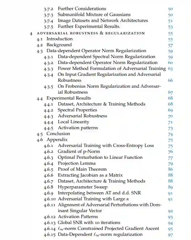 深度学习经历了巨大的增长,这主要得益于更强大的计算机、更大数据集的可用性和软件基础设施的进步,而深度神经网络在机器学习中考虑的几乎每一项任务中都设置了新的最先进的技术。深度神经网络在经验上的成功是无可争议的,但我们对这些模型为什么有效(当它们有效时)的理解仍然有很大的差距,而且它们可能以令人惊讶的方式失败(当被篡改时)。本文研究了为什么强大的深度神经网络有时会失败,以及可以做什么来防止这种情况。虽然深度神经网络对随机噪声具有很强的鲁棒性,但已有研究表明,在面对所谓的对抗性例子时,它们的准确性会急剧下降,即输入信号的专门设计的小扰动,通常是人类无法察觉的,足以导致模型输出的大变化。这种明显的脆弱性令人担忧,因为深度神经网络开始在现实世界中激增,包括在安全关键部署中。最直接和流行的鲁棒化策略称为对抗训练,它在训练过程中使用对抗例子作为数据增强。本文在深度神经网络的对抗性训练和算子范数正则化之间建立了理论联系。证明了ℓp -范数约束的投影梯度上升对抗性训练,在干净和扰动输入的logits上具有ℓq -范数损失,与数据依赖(p, q)算子范数正则化等价。这种基本联系证实了长期存在的论点,即网络对对抗性样本的敏感性与其谱特性有关,并暗示了增强和抵御对抗性攻击的新方法。我们还提出了一种利用对抗性攻击引入的某些异常的检测方法。具体来说,我们提出了一种测量特征表示和对数概率在噪声下如何变化的方法:如果输入是对位摄动的,噪声诱导的特征变化倾向于有一个特征方向,而如果输入是自然的,它倾向于没有任何特定的方向。我们评估了针对强迭代攻击的方法,并表明即使对手意识到防御也无法躲过我们的检测器。