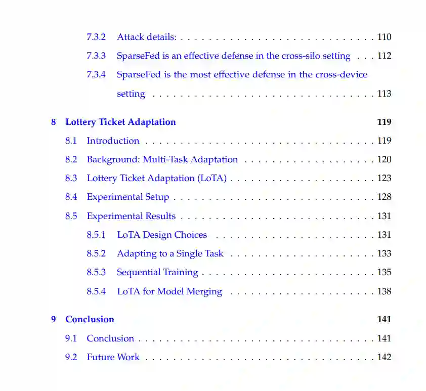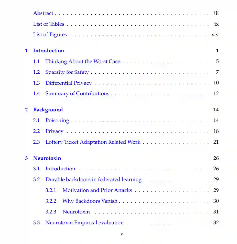 在本论文中,我们将专注于理解AI安全中的最坏情况场景,并探讨基于稀疏性的缓解方法,如稀疏训练。 最坏情况下的AI训练问题源于稀疏性。我们首先在联邦学习(Federated Learning, FL)的背景下考虑对私密数据的适应。由于其分散化的性质,联邦学习系统在训练过程中固有地易受到对抗性后门攻击【Bhagoji et al., 2019】。在这种攻击中,攻击者的目标是通过恶意更新在模型中植入所谓的后门,使得在测试时,模型对某些输入的输出可以被固定为给定目标。在第三章中,我们提出了一种简单的后门攻击修改方案“Neurotoxin”,该方法通过攻击训练中参数变化较小的参数来实施攻击。接下来,我们在拟合模型到用户私密数据的背景下,考虑对私密数据的适应。在这种情况下,我们的主要关注点是理解私密信息如何可能从模型中泄漏。我们首先引入了一组新攻击,这些攻击通过有针对性地设计数据来诱发模型的记忆。在第四章中,我们提出了一种名为“Neural Phishing”的新型攻击,它利用了大语言模型(LLM)中的逐字稀疏性来诱发记忆。我们考虑一种情境,其中攻击者希望模型记住某个用户的未知私密信息,这些信息表现为单个训练样本中的少数几个词元。攻击者能够在模型的训练数据中注入恶意数据。他们设计的序列跨越了用户正常数据分布的支持范围,模型拟合这些数据后,当它看到用户的样本时,只需拟合那些私密词元,因此梯度是逐词稀疏的,模型便记住了这些私密词元。在第五章中,我们介绍了一种LLM的隐私审计方法,这种方法形式化了我们对隐私攻击的直觉。我们的攻击利用了LLM嵌入矩阵更新中的稀疏性,设计出包含在训练数据中极不可能出现的词元模式的诱饵数据,以使嵌入矩阵的梯度稀疏化。 稀疏训练可以缓解隐私和安全问题。在第七章中,我们提出了一种新型防御方法SparseFed,该方法通过全局top-k更新稀疏化和设备级梯度剪辑来缓解联邦学习中的模型中毒攻击。我们为分析防御措施对中毒攻击的鲁棒性提供了理论框架,并对我们的算法的鲁棒性和收敛性进行了分析。在第六章中,我们将稀疏性与隐私的关系应用于差分隐私(DP)模型训练的改进。我们的隐私审计结果显示,模型的最坏隐私损失出现在数据可以诱发稀疏梯度更新的场景中。因此,我们设计了一种方法,通过仅更新低维度的参数集来限制模型的攻击面。我们的方法在DP训练的计算效率、隐私保护和质量方面比之前的工作有了显著提高。在第八章中,我们将稀疏训练用于多种模型适应情境中的安全改进,并提出了“Lottery Ticket Adaptation”方法。我们的方法通过识别“中奖票”,即在将预训练模型适应给定任务时最重要的参数,创建了一个静态稀疏掩码,用于整个训练过程。我们证明了这种稀疏性约束在模型适应过程中可以防止模型学习到有害行为。