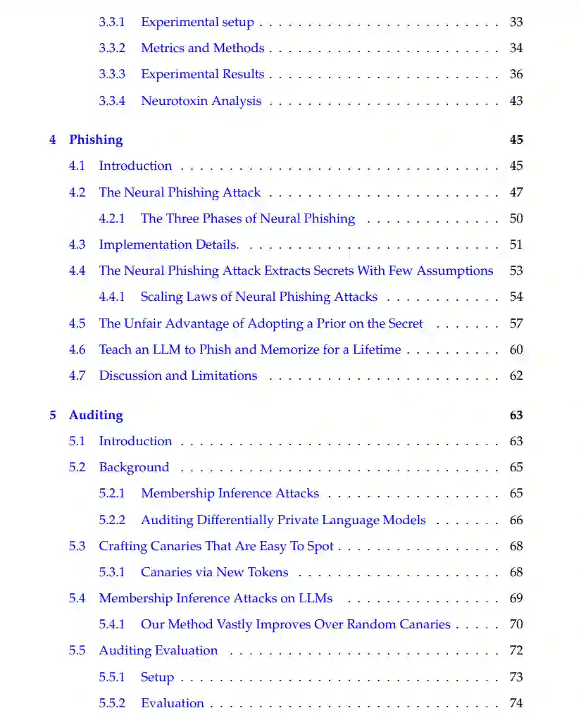 现代人工智能的定义已被大型神经网络的使用所塑造,这些网络在大规模的网络数据集上进行训练。由于训练数据集的规模庞大,这些数据集已无法被有效过滤。我们展示了这些模型能够逐字复现私密数据,并可能学到有害或有毒的行为,即使私密或有害数据在训练数据中仅占很小的比例。理解为什么以及如何模型会学习到不良行为,例如记住私密数据或产生有害行为,已经成为AI安全社区的核心问题,这是缓解私密数据记忆和防止模型生成有害响应的第一步。 我们的核心洞见在于,过参数化模型中的某些参数在自然状态下是稀疏更新的,也就是说,这些参数仅用于拟合一些分布外的数据。这使得攻击者能够通过设计数据或梯度更新,专门针对这些稀疏更新的参数,改变模型在一小部分输入上的行为。同样,我们提出基于稀疏性的防御措施,限制模型的更新范围至那些对大部分训练最重要的参数。 计算机安全中的一个基本概念是限制攻击面,而我们通过稀疏训练在机器学习中实现了这一点。我们将稀疏性的方法应用于攻击和防御中,以防止模型学习到有害行为或记住私密数据。 基础模型的增长得益于在从网络上抓取的大规模数据集上进行训练,但这也带来了新的隐私和安全问题。网络规模的数据集使得训练万亿参数的基础模型成为可能,但也使我们无法监控输入模型的数据。我们不知道这些数据集中包含了什么,但大量研究已经表明,训练这些数据集中的私密或有害信息存在风险【Carlini et al., 2019, 2021, 2023a, Biderman et al., 2023a】。目前尚不清楚模型是如何学习记忆私密数据的,但很明显我们可以从模型的训练数据中提取出记忆的信息【Nasr et al., 2023a】。我们也不确定模型是如何从其训练数据中获取有害行为的,但已清楚的是,训练好的模型经常表现出有毒的特征或顺从不安全的用户请求【Hubinger et al., 2024】。这种“AI安全”问题尤其令人担忧,因为模型每天都被部署到与人类的交互中,随着模型能力的增强,滥用的潜力也随之增加。 隐私和安全问题已从消费者的担忧上升为对大规模AI研究领域的生存威胁。数据提供者无法阻止用户数据被基础模型记忆并复现,因此他们已经开始关闭对其数据的所有访问;结果是,可用于网络训练的数据量每年都在减少【Longpre et al., 2024】。立法者不愿接受行业研究实验室缺乏问责制的现状,已开始对AI的发展进行监管【Scott Weiner, 2024】。从行业研究实验室到学术研究人员再到联邦机构,各方都有明确而紧迫的动力去理解前沿模型是如何学习到不良行为的,如记住私密数据或产生有害信息,以便防止这些问题并重建对AI的信任。 然而,问题依然未解决。甚至有人对AI监管的主要批评是,这种要求公司控制其模型行为的监管将永远无法奏效,因为公司无法控制模型的行为,正如它们无法控制模型在训练过程中学到的内容一样。 如何防止基础模型从网络规模的数据集中学习到这些不良行为仍然是AI安全中的一个开放问题,因为这需要首先理解并防止最坏情况下的行为。为了理解AI安全问题并加以缓解,我们应用了安全思维【Schoenmakers et al., 2022】。我们试图理解模型可能的最坏行为,然后研究能够证明有效缓解这些行为的方法。我们使用的视角是考虑模型的攻击面。对于前沿模型来说,这个攻击面是数十亿或数万亿个参数。因此,攻击面非常大,攻击者只需找到一个突破口即可。过参数化并不是AI隐私和安全中的唯一挑战,但它是一个主要的挑战。我们观察到“稀疏激活参数”的出现,这些参数仅用于记忆和复现特定行为,如重复信用卡号码或响应有毒评论。通过理解这一主要挑战,我们可以提出一个简单的防御指导原则:限制模型的攻击面。这主要体现在通过有原则地应用降维技术,如稀疏化,来减少模型的参数量。如果我们能够将需要更新的参数数量减少几个数量级,那么我们也可以将攻击面减少几个数量级。