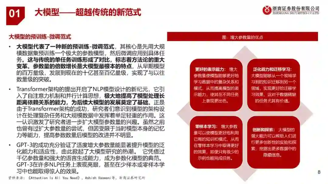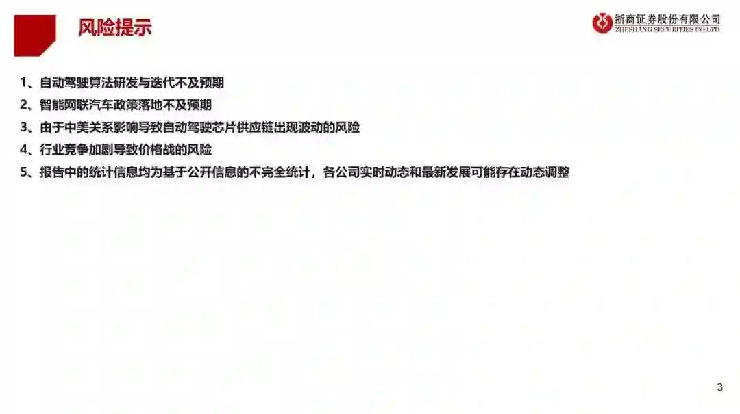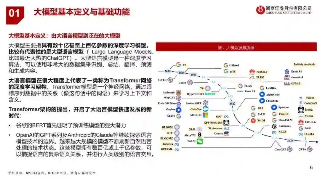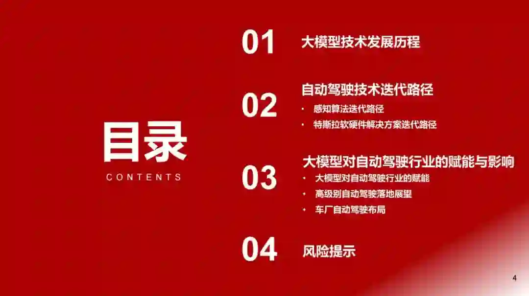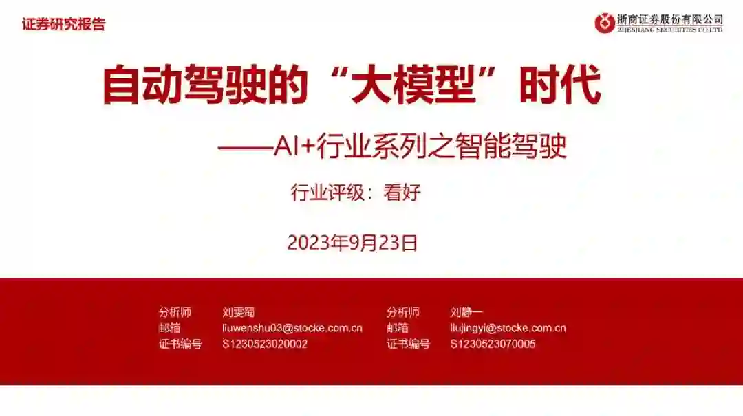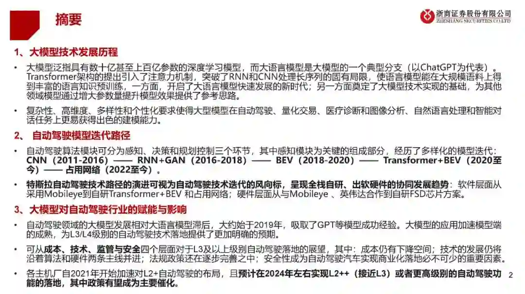 大模型泛指具有数十亿甚至上百亿参数的深度学习模型,而大语言模型是大模型的一个典型分支(以ChatGPT为代表)。Transformer架构的提出引入了注意力机制,突破了RNN和CNN处理长序列的固有局限,使语言模型能在大规模语料上得到丰富的语言知识预训练,一方面,开启了大语言模型快速发展的新时代;另一方面奠定了大模型技术实现的基础,为其他领域模型通过增大参数量提升模型效果提供了参考思路。 复杂性、高维度、多样性和个性化要求使得大型模型在自动驾驶、量化交易、医疗诊断和图像分析、自然语言处理和智能对话任务上更易获得出色的建模能力。 2、自动驾驶模型迭代路径 自动驾驶算法模块可分为感知、决策和规划控制三个环节,其中感知模块为关键的组成部分,经历了多样化的模型迭代:CNN(2011-2016)——RNN+GAN(2016-2018)——BEV(2018-2020)——Transformer+BEV(2020至今)——占用网络(2022至今)。 特斯拉自动驾驶技术路径的演进可视为自动驾驶技术迭代的风向标,呈现全栈自研、出软硬件的协同发展趋势:软件层面从采用Mobileye到自研Transformer+BEV和占用网络;硬件层面从与Mobileye、英伟达合作到自研FSD芯片方案。 3、大模型对自动驾驶行业的赋能与影响 自动驾驶领域的大模型发展相对大语言模型滞后,大约始于2019年,吸取了GPT等模型成功经验。大模型的应用加速模型端的成熟,为L3/L4级别的自动驾驶技术落地提供了更加明确的预期。 可从成本、技术、监管与安全四个层面对于L3及以上级别自动驾驶落地的展望,其中:成本仍有下降空间;技术的发展仍将沿着算法和硬件两条主线并进;法规政策还在逐步完善之中;安全性成为自动驾驶汽车实现商业化落地必不可少的重要因素。 各主机厂自2021年开始加速对L2+自动驾驶的布局,且预计在2024年左右实现L2++(接近L3)或者更高级别的自动驾驶功能的落地,其中政策有望成为主要催化。