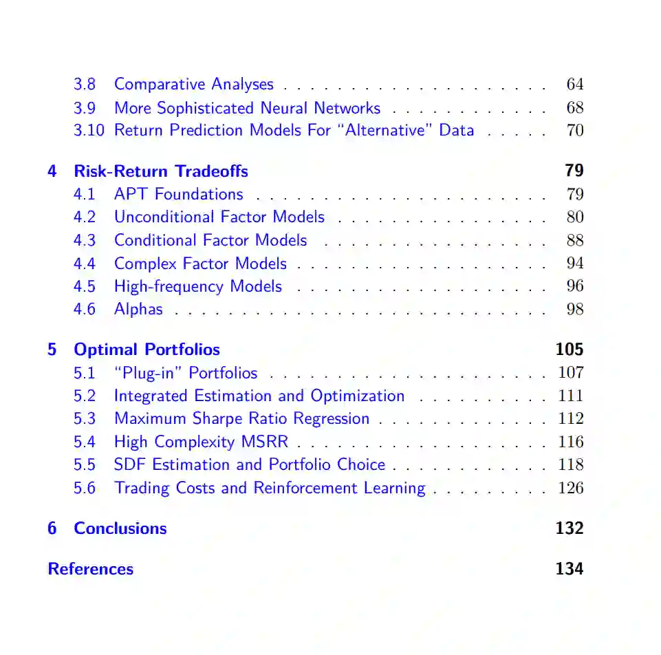 我们试图覆盖关于金融机器学习的蓬勃发展的文献。我们工作的主要目标是帮助读者认识到机器学习是理解金融市场现象的必不可少的工具。我们强调了迄今为止最受研究关注的领域,包括回报预测、风险和回报的因子模型、随机贴现因子以及投资组合选择。遗憾的是,这次调查的范围迫使我们限制或省略了一些重要的金融机器学习主题的报道。一个受益于机器学习方法但被省略的主题是风险建模。这包括条件方差和协方差的模型,特别是高维协方差矩阵的建模。有大量的文献使用机器学习方法来改善协方差矩阵的估计,进而改善优化投资组合的表现。与风险建模密切相关的主题是衍生品定价。事实上,一些在金融领域应用神经网络的最早实例与期权定价和隐含波动率曲面有关。在衍生品研究中,机器学习或非参数模型的突出例子包括Ait-Sahalia和Lo (1998)、Ait-Sahalia和Lo (2000)、Anders等人 (1998)、Rosenberg和Engle (2002)、Bollerslev和Todorov (2011)以及Israelov和Kelly (2017)等。