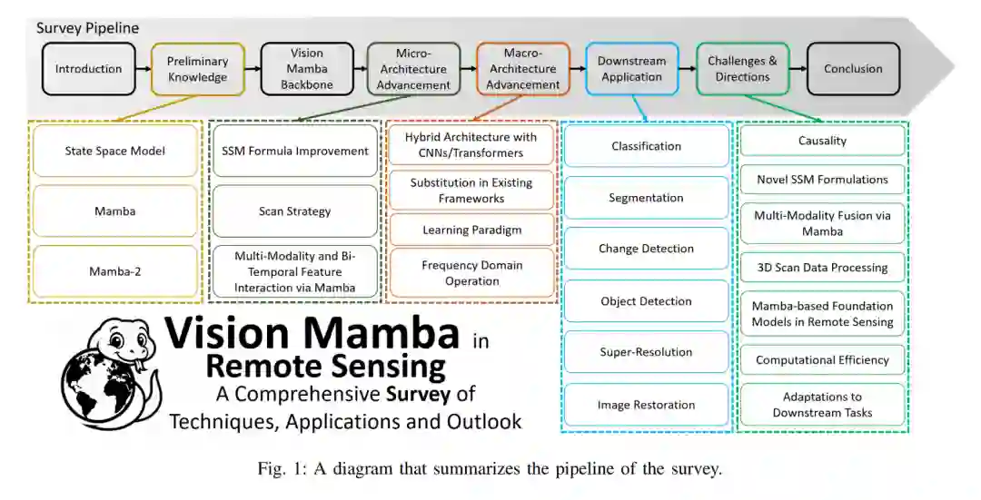 摘要—深度学习已深刻改变了遥感领域,但当前主流架构如卷积神经网络(CNNs)和视觉变换器(ViTs)仍受到一些关键权衡的限制:CNNs受到有限感受野的影响,而ViTs则面临二次计算复杂度问题,这限制了它们在高分辨率遥感数据中的可扩展性。状态空间模型(SSMs),尤其是最近提出的Mamba架构,已成为一种范式转变的解决方案,将线性计算扩展性与全局上下文建模相结合。本文综述了基于Mamba的遥感方法,系统地分析了约120项研究,构建了创新和应用的全面分类。我们的贡献从五个维度展开:(i)视觉Mamba架构的基础原理;(ii)微架构进展,如自适应扫描策略和混合SSM公式;(iii)宏观架构整合,包括CNN-Transformer-Mamba混合体和频域适配;(iv)对比多种应用任务(如目标检测、语义分割、变化检测等)中最先进方法的严格基准测试;(v)对未解决挑战的批判性分析并提出可行的未来方向。通过架起SSM理论与遥感实践之间的桥梁,本综述确立了Mamba作为遥感分析的变革性框架。据我们所知,本文是首个关于Mamba架构在遥感中的系统性综述。我们的工作为通过基于SSM的方法推动遥感系统研究提供了结构化的基础。我们建立了一个开源资源库(https://github.com/BaoBao0926/Awesome-Mamba-in-Remote-Sensing),以促进社区驱动的进步。