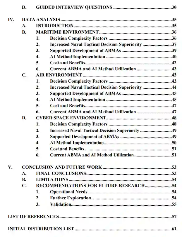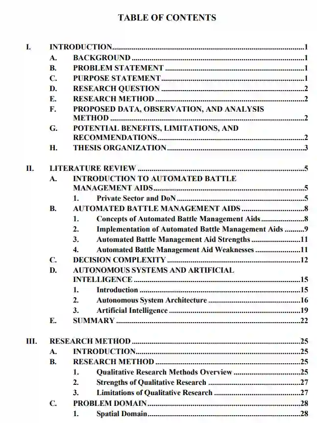 本论文分为五章。第一章概述了本课题的背景,描述了本论文所探讨的问题,本论文的目的,以及研究的方法和范围。第二章对论文中讨论的定义和概念进行了全面的背景回顾,包括自动战斗管理辅助工具、决策复杂性和人工智能及自主系统的概念。第三章描述了用于协调数据采集和理解检索数据要求的研究方法。第四章提供了分析的结果,并探讨了从分析结果中得出的潜在好处和局限。本论文的最后一章包含最后的结论和对未来工作的建议。
