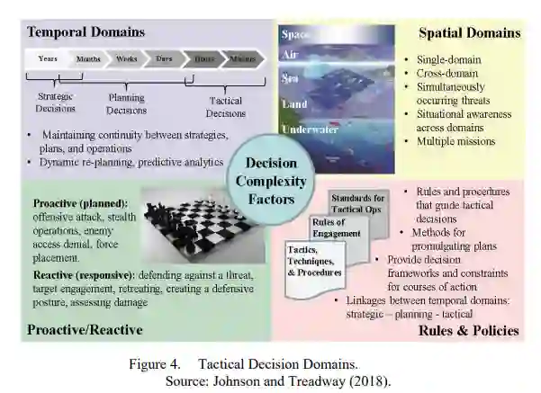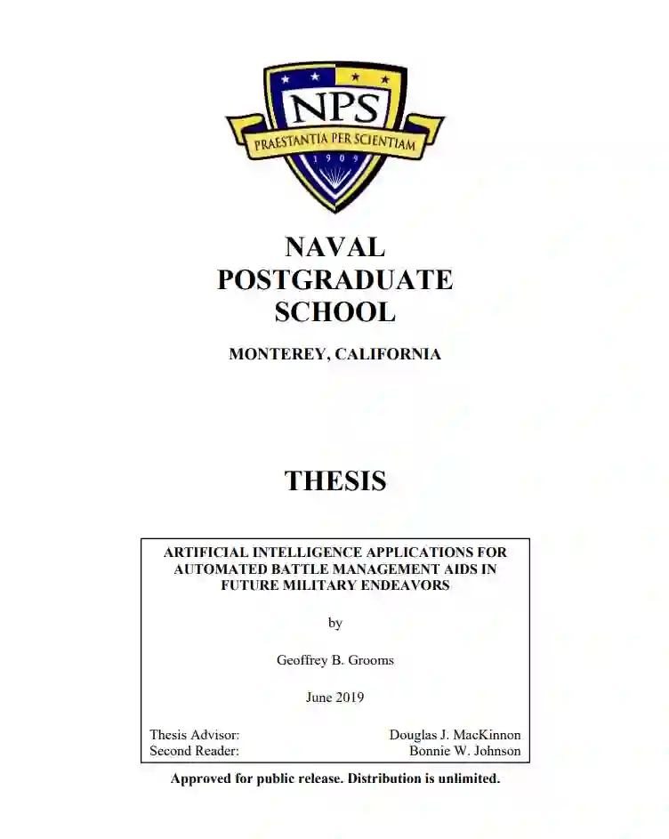 这篇论文试图研究能够改善复杂军事战术环境中决策的人工智能(AI)技术。战术环境在威胁、事件的节奏、突发或意外事件的因素、战斗空间意识的限制以及潜在的致命后果方面可能变得非常复杂。这种类型的环境对战术作战人员来说是一个极具挑战性的决策空间。战术决策任务在识别决策选项、权衡众多选项的相对价值、计算选项的预测成功率以及在极短的时间内执行这些任务方面迅速超越了人类的认知能力。海军已经确定需要开发自动战斗管理辅助工具(ABMA)来支持人类决策者。这个概念是让ABMA处理大量的数据来发展战斗空间知识和意识,并确定战争资源和行动方案的优先次序。人工智能方法的最新发展表明,它有望成为ABMAs支持战术决策的重要推动者。本论文研究人工智能的方法,目的是确定在战术决策领域的具体应用。