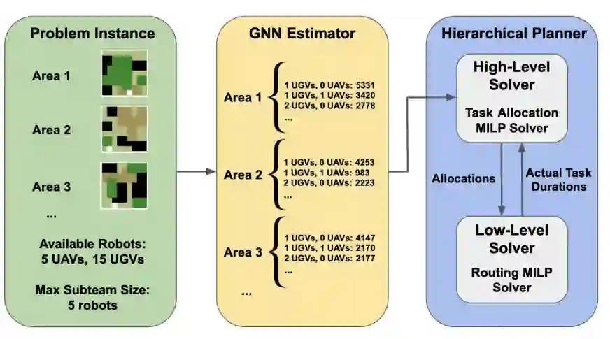 基于这些观察,我们提出了一个分层规划器,能够将原始问题的复杂性分解为两个自然的子问题:将机器人分配到路由任务的高层次问题,以及只为所有可能分配给子团队的区域中的一个选定子集计算实际路由路径的低层次问题。由于多机器人路由问题通常是在图形表示的环境中定义的,规划者使用图形神经网络(GNN)作为启发式方法来估计特定联盟在特定路由任务中的子团队性能。迭代后,计划者将这些估计值细化为真正的子团队性能,因为低层问题的解决方案已经可用。我们引入了一个测试平台问题,其中有一个异构多机器人区域检查问题作为基本的路由任务,对此我们再次考虑了基于传统混合整数线性编程表述的解决方法。图1显示了拟议的规划框架的示意图。