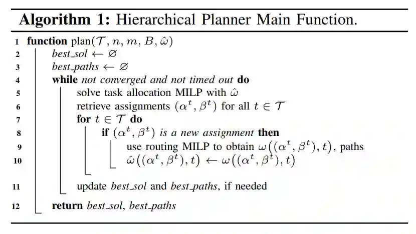 本文考虑了一类特殊的多机器人任务分配问题,其中任务对应于定义在特定环境的不同区域的异质多机器人路由问题。目标是最小化完成所有路由任务所需的时间。这类问题代表了一些场景,在这些场景中,将机器人的子团队分配到各个区域将是有益的。例如,在跨越非常大的环境的搜索和救援行动中,电池的限制可能使一个机器人不能被用于一个以上的区域。另外,在军事场景中,战略区域可能需要在车队通过之前同时检查是否有对手存在。作为最后一个例子,考虑一个通信受限的巡逻场景,将子团队分配到各个区域可以保证机器人将有足够的组间网络,以迅速响应对入侵者的检测。这些类型的问题本质上显示了一个层次结构:如果我们事先知道每个可能的机器人子团队完成每个可能的路由任务所需的时间,我们可以首先确定子团队对感兴趣区域的最佳分配,然后只计算该分配的实际子团队路径。优化处理第一阶段的一个直接方法是预先计算所有可能的子团队任务分配的路径,这将提供所有可能的路由时间作为一个副产品。不幸的是,即使不考虑分配问题的组合性,通常情况下,由子团队分配产生的多机器人路由问题是NP-hard,只有通过计算昂贵的算法方法才能得到一个好的解决方案,例如将路由问题表述为混合整数线性程序(MILP),通常需要几秒钟到几分钟或几小时的运行。为了减少整体规划时间,寻找一个好的分配应该以懒惰的方式解决路由任务问题,从最有希望的子团队分配给任务开始。然而,知道一个分配的潜在效用通常需要知道它的路由计划,消除了懒惰方法的优势。