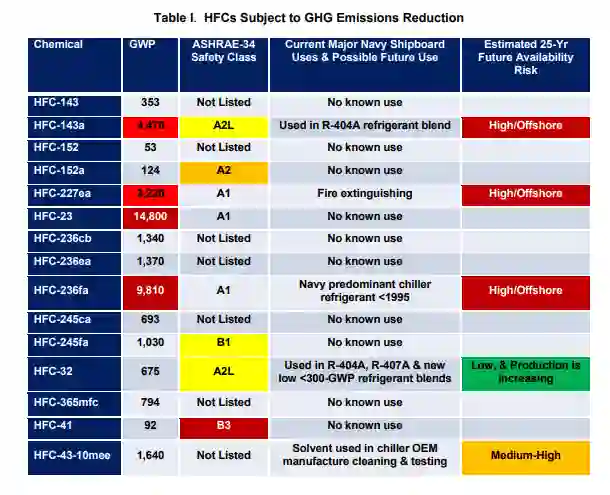 随着氢氟碳化物(HFCs)生产根据《美国创新与制造法案》(公法116-260,2020年)逐步缩减,以及美国已批准(2022年)的《蒙特利尔议定书》基加利修正案,美国海军正致力于识别替代制冷剂以支持任务关键功能,如空调、制冷和泵驱两相冷却应用。氢氟碳化物目前用作空调装置(通常称为冷水机组)、冷藏/冷冻食品储存的制冷单元以及泵驱两相冷却应用中的制冷剂,这些应用支撑着美国海军舰船上的各种任务关键功能。美国海军研究办公室(ONR)一直在研究用于美国海军水面舰船空调与制冷系统的低全球变暖潜能值(GWP)氢氟碳化物替代品。开发了一个先进的离心压缩机冷水机组模型,用于分析多种冷水机组在使用不同低GWP制冷剂时的性能及生命周期气候性能(LCCP)。初步危害分析(PHA)评估了有前景的候选制冷剂在空调和制冷系统应用中的压力容器安全性、可燃性、毒性、不同泄漏率下的点火敏感性、性能及材料相容性。因此,基于对这些效益与风险的分析,已起草一份推荐的美国海军水面舰船制冷剂可持续性战略。该战略基于多变量风险层级,包含多种解决方案:近期继续使用安全、低排放、高效、紧凑的HFC-134a冷水机组;二氧化碳用于大型冷藏仓库;微可燃制冷剂用于步入式制冷设备;以及丙烷和异丁烷等可燃制冷剂用于自动售货机和厨房设备等小型独立设备。