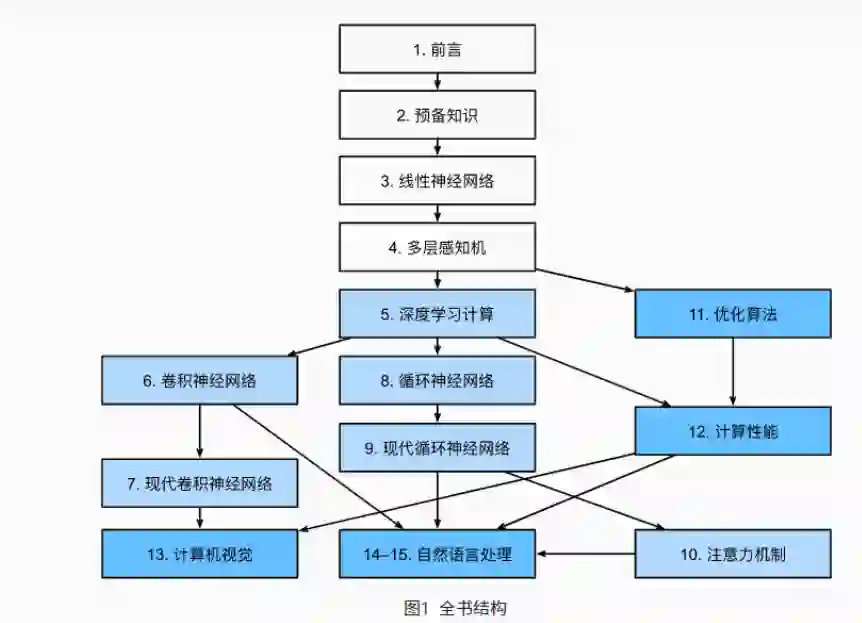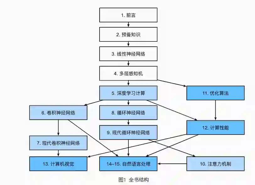第三部分讨论可伸缩性、效率和应用程序。 首先,在 11节 中,讨论了用于训练深度学习模型的几种常用优化算法。下一章 12节 将探讨影响深度学习代码计算性能的几个关键因素。在 13节 中,展示了深度学习在计算机视觉中的主要应用。在 14节 和 15节 中,展示了如何预训练语言表示模型并将其应用于自然语言处理任务。