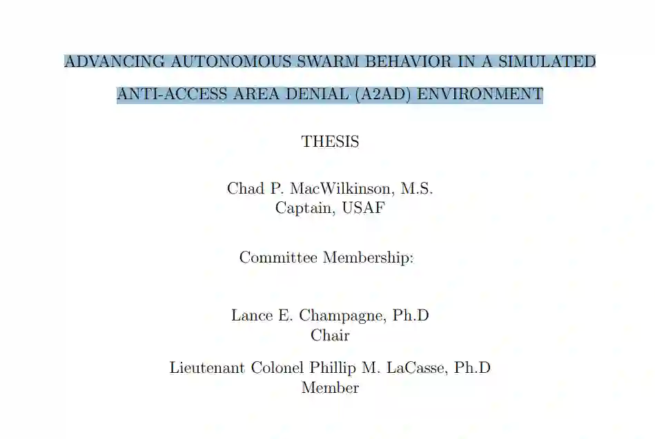 现代一体化防空系统(IADS)的最新进展加强了反介入区域拒止(A2AD)环境,从而削弱了美国空军曾经拥有的高精尖隐形平台优势,促使高级国防领导人呼吁改革空战性质,以挑战这些威胁。针对这一新要求的解决方案是武器蜂群技术,该技术通过与大量低成本但具有致命性的航空资产交战,并通过自主功能加以强化,从而有能力压倒 IADS。本研究提出将四维自主框架应用于高亚音速巡航导弹武器群。该框架被定义为单独行动能力、群内通信能力、适应能力和领导者与追随者合作能力。使用高级仿真、集成和建模框架(AFSIM)构建了一个虚拟的 A2AD 环境,其中涉及两支对立部队之间的作战行动。有人驾驶的穿透式轰炸机随后将释放自主巡航导弹群,以便在 A2AD 战斗空间内展开竞争。通过设计实验,对自主性各维度对打击组合的影响进行了统计测试。分析结果表明,在 95% 的置信度下,自主性框架对所有效果测量都有显著影响。机群内部通信能力为机群的进攻和防御性能带来了最大的好处,最明显的是机群探测和摧毁新威胁的能力提高了 51.9%。